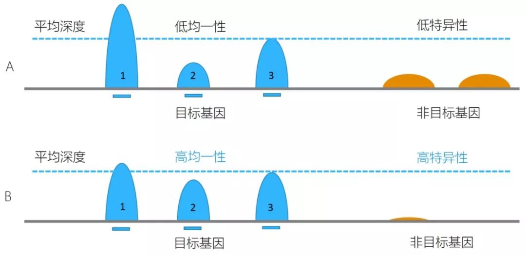 除了捕获特异性之外,还应该重点关注的技术指标是目标区域的覆盖均一性。通俗来讲,就是每个区域的覆盖深度是不是均匀。如图1所示,可以很直观地看到,A数据的目标基因1的覆盖深度远远高于平均深度,而目标基因2,覆盖深度远远低于平均深度;而B数据目标区域的覆盖就相对要均一很多。那么我们为什么要关注覆盖均一性这个指标呢?因为如果覆盖均一性不好,即使测了100X平均深度的数据,仍然会有很多区域的覆盖是少于20X的,那么对这些区域的遗传变异检测就是不准确的。