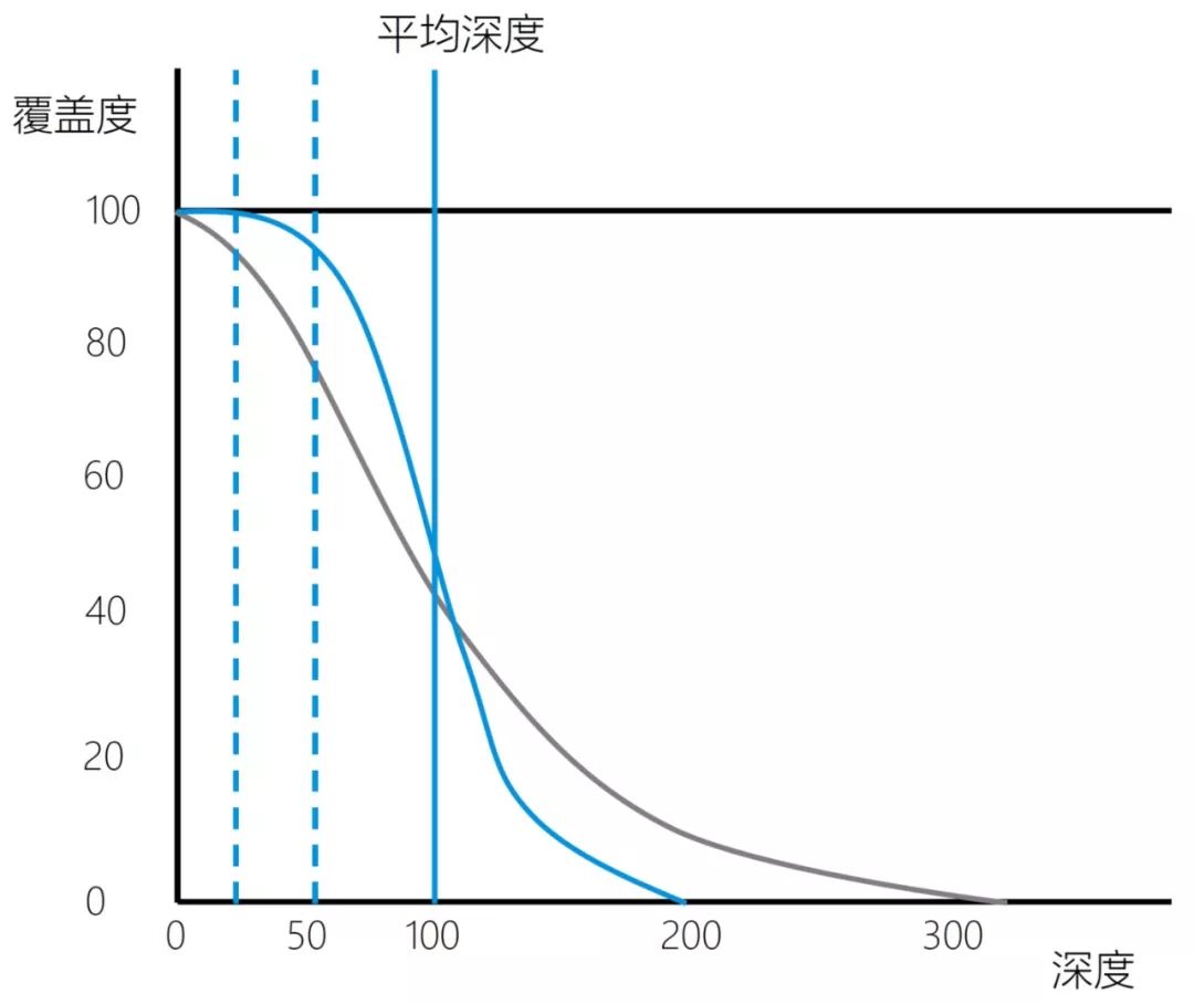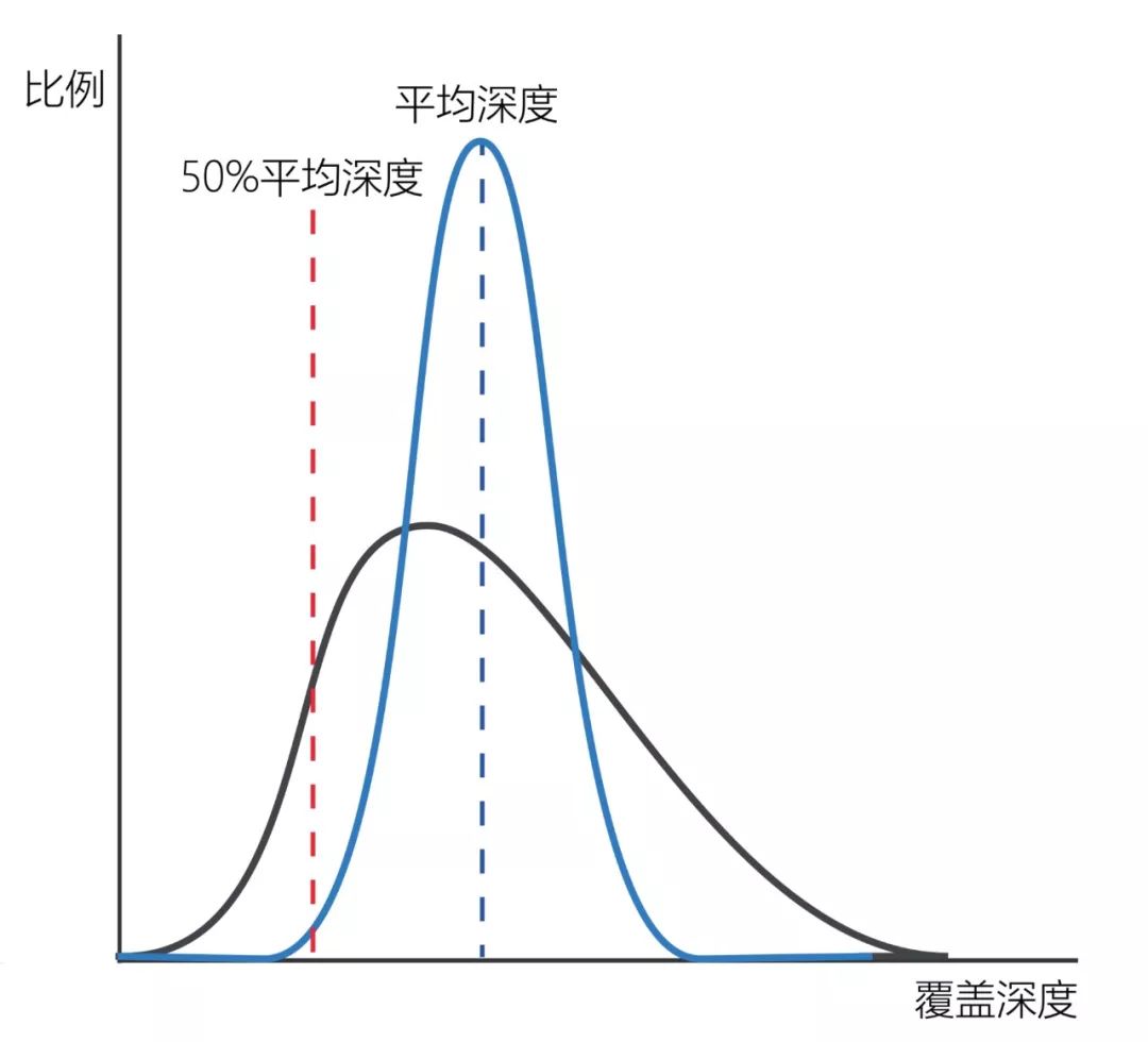 那么用什么数据指标来评价覆盖均一性呢?对于捕获测序数据,如果我们对目标区域每个位点的深度做一下统计,会发现深度的分布是符合泊松分布的(如图3,近似正态分布)。对于均一性好的数据,测100X的平均深度,则大部分区域的深度都接近100X,其深度的分布图会呈现很窄的峰(蓝色);而均一性不好的数据,其位点深度分布会更离散,则会呈现很宽的峰(黑色)。在平均深度的50%的位置拉一条竖线,那么分布曲线在竖线左侧的积分面积就是低于50%平均深度的位点的比例。那么我们可以知道,均一性好的数据,低于50%平均深度的位点就会很少,即50%平均深度的覆盖度会比较高。而均一性不好的数据,就会有很大比例的位点覆盖深度是低于50%平均深度的。因此我们会用20%平均深度的覆盖度或50%平均深度的覆盖度来评价数据的均一性。 更为直观的,我们可以用累计深度分布图来分析(图4),在一定测序平均深度情况下深度和覆盖度的关系。我们可以在平均深度和20%平均深度,50%平均深度的位置拉一条垂线,这样就可以直接算出20%平均深度的覆盖度和50%平均深度的覆盖度。如果数据均一性比较好(蓝色),那么随着深度增加,覆盖度就会下降较慢,20%平均深度的覆盖度和50%平均深度的覆盖度就会比较高;如果数据均一性不好(灰色),那么随着深度增加,覆盖度就会下降较快,20%平均深度的覆盖度和50%平均深度的覆盖度就会比较低。