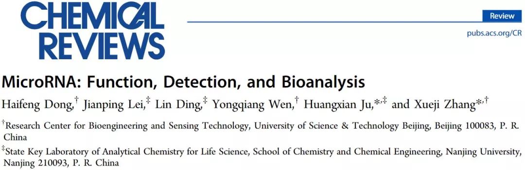 miRNA是一种广泛存在于真核生物、大小约为20-25个核苷酸的内源性单链小分子RNA。研究发现miRNA调节人类1/3的基因, 成熟的miRNA生物学效应是降解或是阻遏靶mRNA的翻译, 进而参与生命过程许多的重要进程。如上所述, miRNA具有双向调控功能, 在肿瘤的发生发展的基因层面上同样具有促进或者抑制作用。下面这篇张学记老师通讯的综述详细叙述了microRNA的功能及其在检测领域的应用。
