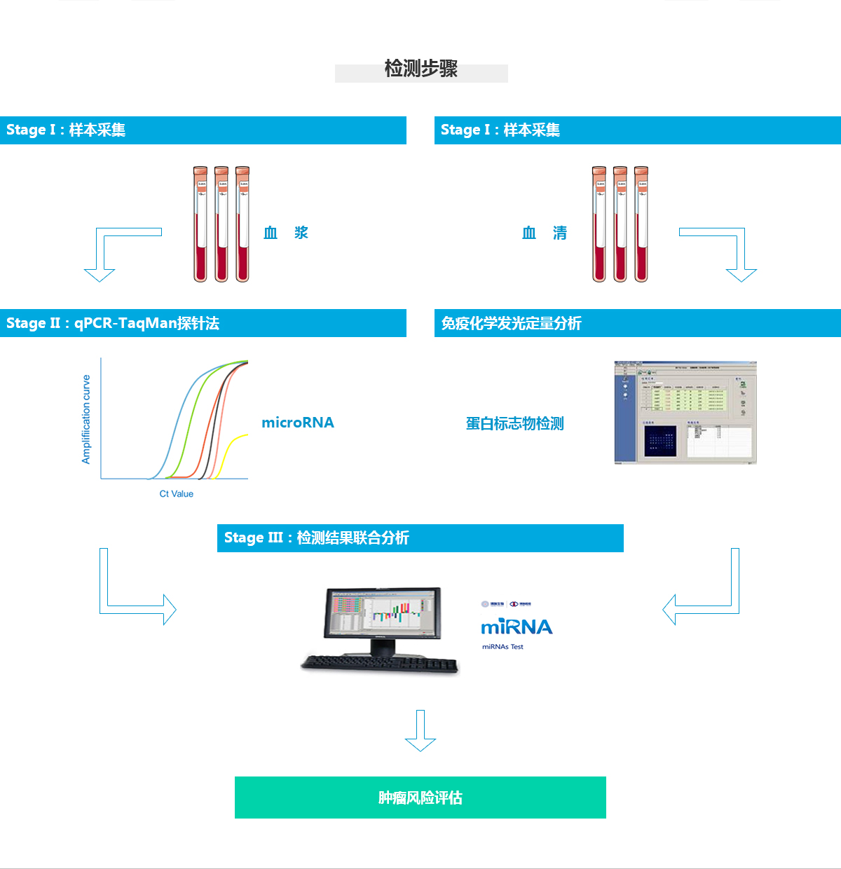 具体检测原理和miRNA7™肝癌分子诊断试剂盒类似,从血浆中提取总RNA后,采用特异的茎环引物对目标microRNA进行混合反转录,然后基于高敏感性的TaqMan实时荧光定量PCR方法对microRNA进行定量。最后采用生物信息学分析评估受检者肿瘤发生风险,用于肿瘤的早期预警。其AFP检测采用另一份血清完成,使用化学发光法进行AFP的定量检测。