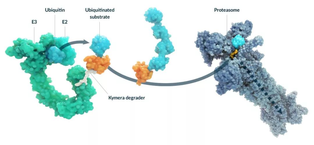 临床专攻:利用细胞的泛素-蛋白酶体系统,靶向降解致病蛋白。 利用细胞的泛素-蛋白酶体系统靶向降解致病蛋白正在成为靶向“不可成药”蛋白的一个重要手段。Kymera公司已经开发出一系列能够将E3连接酶与靶点蛋白拉到一起的小分子工具。该公司的技术平台目前已经开发出靶向蛋白激酶IRAK4和转录因子STAT3的蛋白降解剂。该公司的主打产品KYM-001靶向携带突变的IRAK4,可以用于治疗侵袭性B细胞淋巴瘤。这款在研疗法即将在今年下半年进入临床期开发阶段。 该公司去年完成6500万美元的B轮融资,并且与葛兰素史克(GSK)和Vertex Pharmaceuticals公司分别达成研发合作。