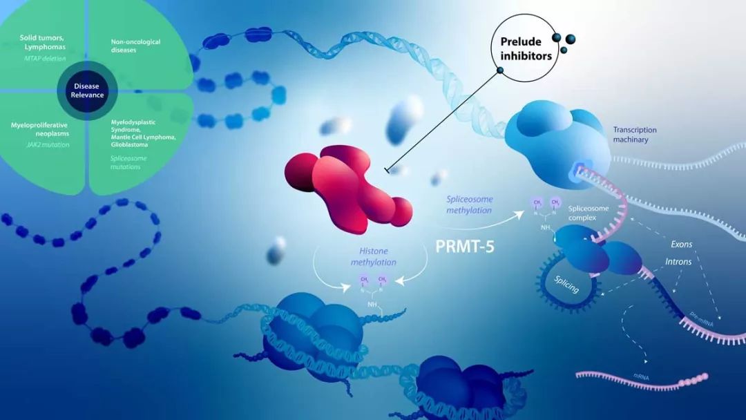 新锐名称:Prelude Therapeutics临床专攻:通过靶向蛋白质精氨酸甲基转移酶5(PRMT5),治疗耐药性实体瘤和血液癌症 治疗获得性耐药性是多种癌症患者在获得缓解之后疾病复发的主要原因。Prelude公司的研发策略是开发靶向介导获得性耐药性的信号通路。该公司的主打产品靶向PRMT5。PRMT5是一种在组蛋白和其它蛋白的精氨酸上添加甲基化修饰的蛋白酶。精氨酸甲基化能够影响mRNA剪接,细胞周期等生理过程,被认为是致癌和耐药性产生的重要机制。它在多种癌症中过度表达,包括膀胱癌,三阴性乳腺癌,以及淋巴瘤和髓系血液癌症。 该公司的主打PRMT5抑制剂PRT543目前在1期临床试验中接受检验。PRMT5同时在MYC介导的致癌作用和JAK3信号通路中也起到重要作用,是一个富有潜力的靶点。