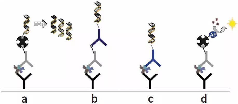 目前,该技术已经有多种形式。其中最常见的是利用生物素标记的核酸分子进行信号扩增(图a)。免疫PCR难点之一在于抗体与寡核苷酸缀合的技术复杂性和稳定性。然而,抗体缀合技术的新发展意味着现在可以更有效地进行免疫PCR,特别是生物素标记核酸技术的成熟,使得这种技术逐步实现商业化。