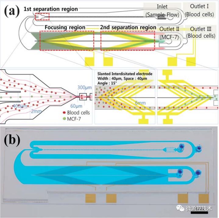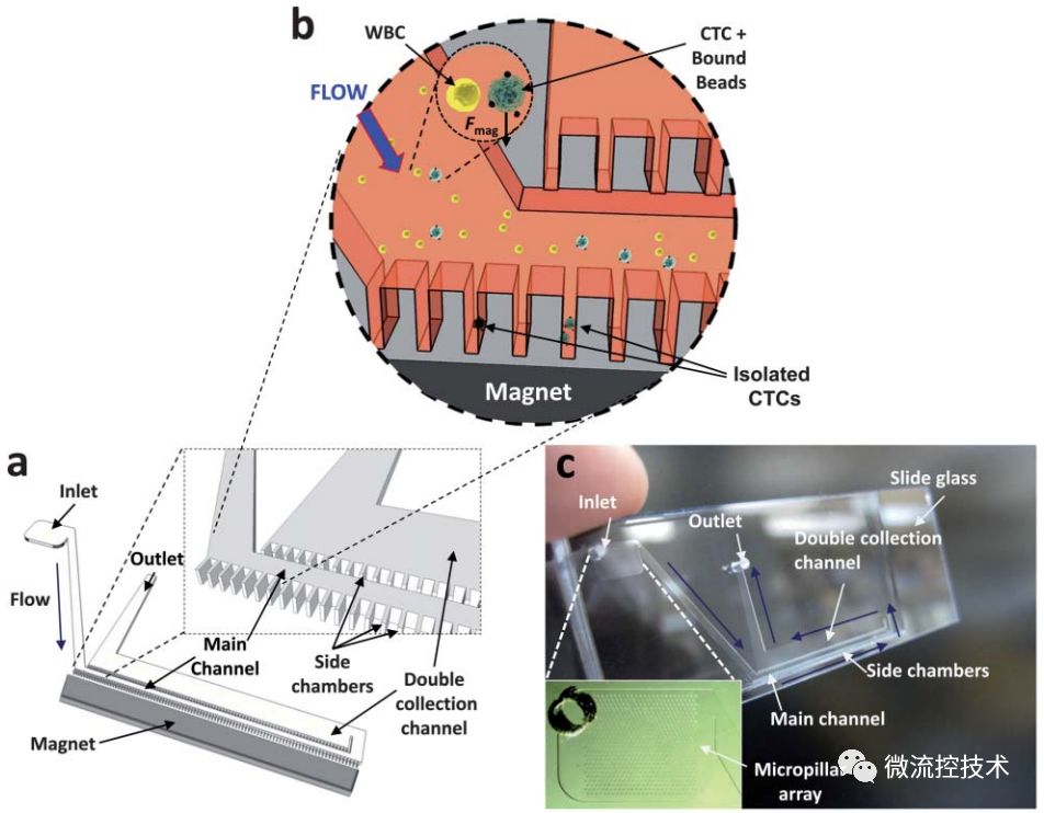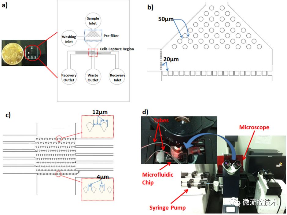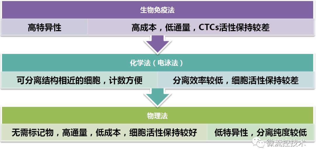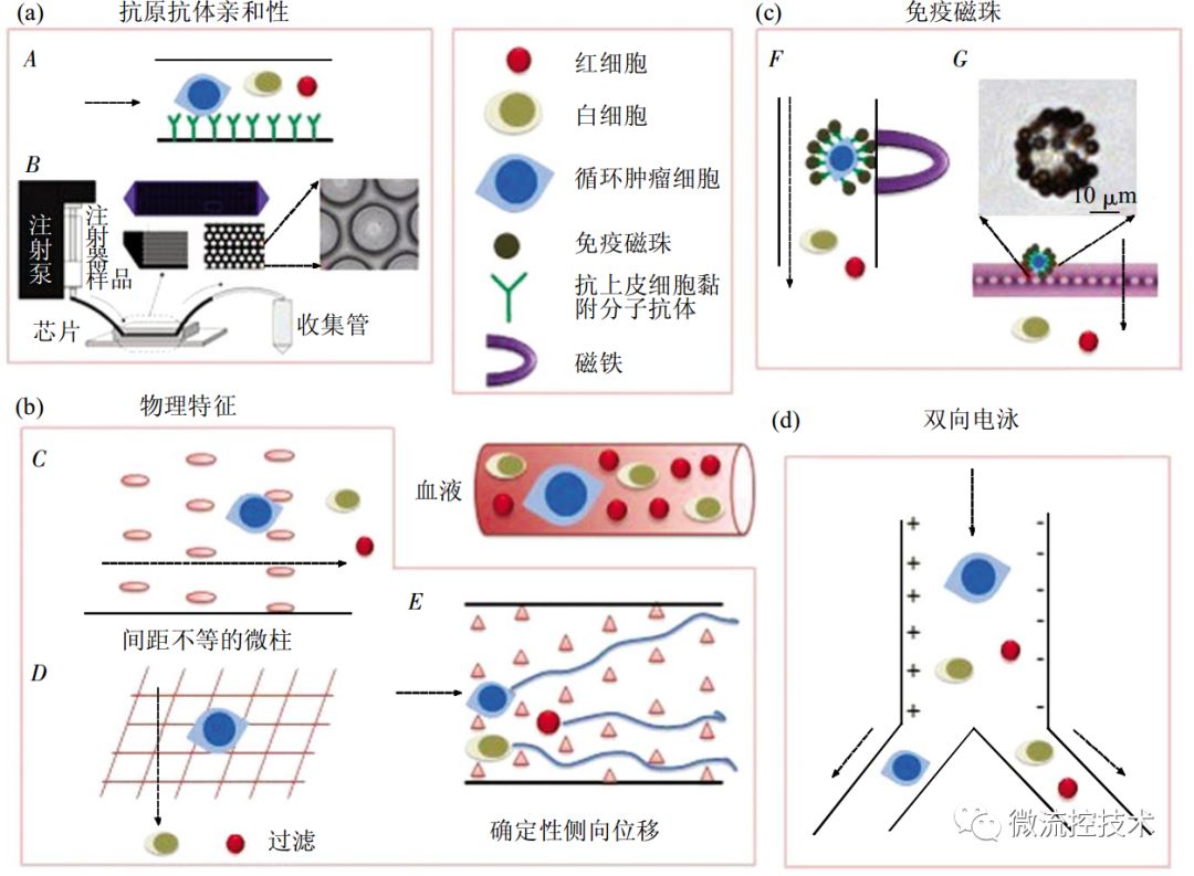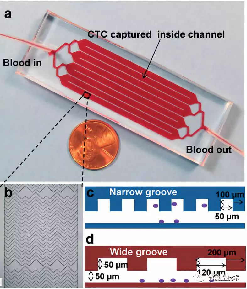 图解用于循环肿瘤细胞富集分离的微流控技术 恶性肿瘤已成为我国死亡率最高的重大疾病之一。肿瘤的原发病灶往往并不会直接导至死亡,肿瘤转移疾病是肿瘤患者临床致死的主要原因,因此肿瘤转移的早期准确检测就显得尤为重要。循环肿瘤细胞(CTCs)在循环系统当中被检测到,这可以提示可能有肿瘤存在转移情况,因此对CTCs进行检测有助于肿瘤的早期诊断、肿瘤治疗效果评估以及个体化治疗。微流控技术具有低试剂样本消耗、快速、低成本、高通量、使用简单等优点。目前已经有很多研究团队利用微流控技术对CTCs进行富集、分离、检测等研究,成功地实现了快速、高捕获效率、高检测灵敏度的CTCs检测工作。 本文目的是采用以图片展示为主,结合讲解文字的形式,分类当前用于CTCs捕获、富集和检测的微流控芯片系统。帮助大家了解认识微流控技术在CTCs研究领域的应用。(好像还是文字太多 )01 什么是CTCs CTCs是从实体瘤,发生上皮-间质转换进入血液混合的恶性肿瘤细胞,转移之后会在其他组织器官补位产生肿瘤。 02 CTCs富集分离的微流控技术 微流控芯片捕获 CTCs 各类芯片结构示意图 (a) 亲和性分选法 (A: 亲和性分选芯片原理示意图; B: 亲和性分选芯片系统装置及芯片内部微柱显微照片). (b) 物理特征分选法 (C: 大小 - 变形性分选微柱捕获示意图; D: 大小 - 变形性分选微孔捕获示意图; E: 确定性侧向位移芯片示意图 ). (c) 免疫磁珠分选法 (F: 免疫磁珠捕获原理示意图; G: 磁珠和大小 - 变形性方法结合捕获示意图,细胞与磁珠结合后,尺寸增加,更有利于细胞被捕获). (d) 双向电泳分选法示意图. 03 生物免疫方法 Weian Sheng制作了集合增强混合芯片,芯片大小与载玻片相同,8个并联管道增大了血液通量,每个通道由鱼脊形结构组成,该结构可以形成流体涡流,从而提高细胞与抗体质检的接触几率,有利于抗体高效捕获CTCs,研究人员将人胰腺癌细胞混入健康人血液作为待测样本进行实验,捕获效率高达90%。被捕获的肿瘤细胞还保持活性,可以继续培养实验。 Joo H. Kang设计了一种由PDMS组成微磁-微流控CTCs分离芯片,该芯片有一条主通道,主通道两侧有内凹型小室,每个小室中均装有磁铁。当样品流经主通道时,由于细胞在小室处所受的流体剪切力最小,已经通过免疫反应包被了磁珠的CTCs就会在磁场的作用下被捕获在小室中.该系统所用样品为在1ml小鼠血液中掺杂了2~80个不等的乳腺癌细胞,其捕获效率可达 90%. 04 双向电泳分选法 Hui-Sung Moon设计了一种MOEF(多孔口流体分选)和DEP(双向电泳分选)集合的CTCs分选富集微流控芯片,首先在第一个分离区域,使用MOEF流体动力分选富集MCF-7乳腺细胞和少量血细胞,其中大量的血细胞从出口I分离出。然后在聚焦区域,剩余的细胞通过DEP二次分选富集,最终实现了快速高纯度(99%的红细胞,94%白细胞)的CTCs分选富集。 05 物理方法 Peitao Lv设计了一种间距渐变式捕获芯片,该芯片结构由过滤和捕获两个部分构成.过滤部分的作用是滤掉血液中的杂质,减少芯片堵塞,增大流量;捕获部分则设计了不同间距微柱,间距从12um到4um递减,血细胞可通过微柱,而肿瘤细胞体积较大则被捕获,肿瘤细胞混入磷酸盐缓冲液悬液样品的捕获效率高达90%以上. Kevin Loutherback基于确定性侧向位移法(DLD)设计了可在数分钟内分离CTCs的芯片。芯片整体尺寸为2.5mm*25mm,微结构中三角柱边长58um、间距42um,排列与液流方向呈1/20弧度角。三角柱更有利于防止堵塞。液体流过微柱时,直径较大的肿瘤细胞会向芯片侧壁富集,随液体流出,从而收集CTCs。而体积较小的白细胞和红细胞(WBCs和RBCs)会沿着流体方向流动。该系统分离混有人乳腺癌细胞 MCF-7的PBS悬液样品效率在 85%以上. 06 各种方法的优缺点比较 虽然目前微流控芯片分析CTCs方面还存在各种各样的问题,面市产品的性能还存在一定的缺陷,但是相信在不远的将来,微流控芯片技术在CTCs分离和富集方面的应用将更加成熟,相应的产品也会越来越多的应用于临床检测。 参考文献: 吕晓庆, 李雷, 陈红梅,等. 生物化学与生物物理进展, 2015(4). Sheng W, Ogunwobi O O, Chen T, et al.Lab on A Chip, 2013, 14(1):89-98. Kang J H, Krause S, Tobin H, et al. Lab on A Chip, 2012, 12(12):2175-2181. Moon H S, Kwon K, Kim S I, et al. Lab on A Chip, 2011, 11(6):1118-1125. Lv P, Tang Z, Liang X, et al. Biomicrofluidics, 2013, 7(3):180-204. Loutherback K, D'Silva J, Liu L, et al. Aip Advances, 2012, 2(4):2527-2535. |