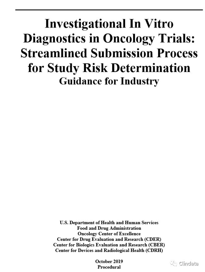 The purpose of this guidance is to describe an optional streamlined submission process for determining whether use of an investigational in vitro diagnostic (IVD) in a clinical trial for an oncology therapeutic is considered significant risk (SR), nonsignificant risk (NSR), or exempt from investigational device exemption (IDE) requirements.2 If the IVD in the trial is determined to be SR in the streamlined process, the sponsor may need to submit an IDE to the appropriate center (Center for Devices and Radiological Health (CDRH) or Center for Biologics Evaluation and Research (CBER)) in addition to submitting an investigational new drug application (IND) to the appropriate center (Center for Drug Evaluation and Research (CDER) or CBER). FDA encourages sponsors to use the streamlined process described in this guidance when possible to reduce administrative burden on sponsors and FDA and to maintain the current level of regulatory review. A study involving an investigational IVD that is determined to be NSR must follow the abbreviated requirements outlined in 21 CFR 812.2(b).3 A study involving an investigational IVD that is determined SR requires an IDE application to be submitted and is subject to the full IDE requirements. In general, FDA’s guidance documents do not establish legally enforceable responsibilities. Instead, guidances describe the Agency’s current thinking on a topic and should be viewed only as recommendations, unless specific regulatory or statutory requirements are cited. The use of the word should in Agency guidances means that something is suggested or recommended, but not required. II. APPLICABILITY OF THE STREAMLINED SUBMISSION PROCESS Sponsors should consider the following information concerning the applicability of the streamlined submission process: • The streamlined submission process described in this guidance applies only to clinical trials involving codevelopment of an investigational IVD with an oncology investigational drug. It does not apply to codevelopment programs in other disease areas. • Sponsors can continue to submit requests for risk determinations to CDRH for investigational IVDs in oncology codevelopment studies using the Q-submission program.4 The sponsor should submit to the appropriate center (CBER or CDER) all information about the oncology codevelopment program (including information about the investigational IVD) in the trial protocol for the IND. As part of the IND review, CBER or CDER will consult with CDRH or CBER, as appropriate, and determine if the investigational IVD is SR, NSR, or exempt. The sponsor should consider the following for the submission: • One sponsor should take the lead in communicating with FDA about the IND. FDA intends to communicate all feedback (including feedback about the investigational IVD) to the same lead sponsor. Sponsors should consider the following: — In the case where multiple IVDs are used in the oncology therapeutic trial, the drug and IVD sponsors should determine who will serve as the lead sponsor for communications with FDA — The lead sponsor should ensure that FDA receives appropriate letters of authorization to cross-reference the premarket submissions or incorporate relevant content by reference • The list below highlights how a sponsor should present information in the original IND submission to facilitate the streamlined submission process, when applicable: — On Form FDA 1571, Investigational New Drug Application, (in section 11 under “Other”), sponsors should include the text Streamlined IVD SRD to indicate the intent to utilize the streamlined submission process. A sponsor also can include this information in a cover letter if the sponsor intends to submit a cover letter with the IND and indicate which section(s) of the electronic common technical document contains relevant information. — In the protocol submitted to the IND,6 a sponsor should include information about how the IVD will be used in the trial; however, detailed information about the performance of the device is generally not required. Types of information to add to the protocol include the following: Description of the device How the results from the investigational IVD will be applied in the clinical trial A description of the population and information regarding what is known about the prevalence of the biomarker (evaluated by the investigational IVD) in the patient population The specimen type that will be collected for investigational IVD testing (including the anatomical site) and whether any biopsy conducted exclusively for • The streamlined submission process described in this guidance does not apply to INDexempt studies. • The streamlined submission process described in this guidance can only be used for new INDs and does not apply to a new protocol submitted to an existing IND or protocol amendments introducing or changing the use of an investigational IVD. • FDA encourages sponsors to discuss their interests in using this streamlined submission process during pre-IND meetings. • If an invasive biopsy that presents a potential for serious risk to the health, safety, or welfare of the subject is required for investigational IVD testing for enrollment,5 the trial is not eligible for the streamlined submission process. If a sponsor submits such a trial via the streamlined process, FDA will notify the sponsor to consult with CDRH or CBER for a study risk determination through the Q-submission to allow for greater input from CDRH or CBER staff. — By signing Form FDA 1571 (section 17) sponsors provide assurance of an institutional review board review of the complete clinical trial protocol and activities for the investigational IVD and the investigational drug.8 FDA recommends that informed consent documents reviewed by the IRB address any risks associated with the trial, including the consequences of an incorrect biomarker test result from the investigational IVD during the screening phase a