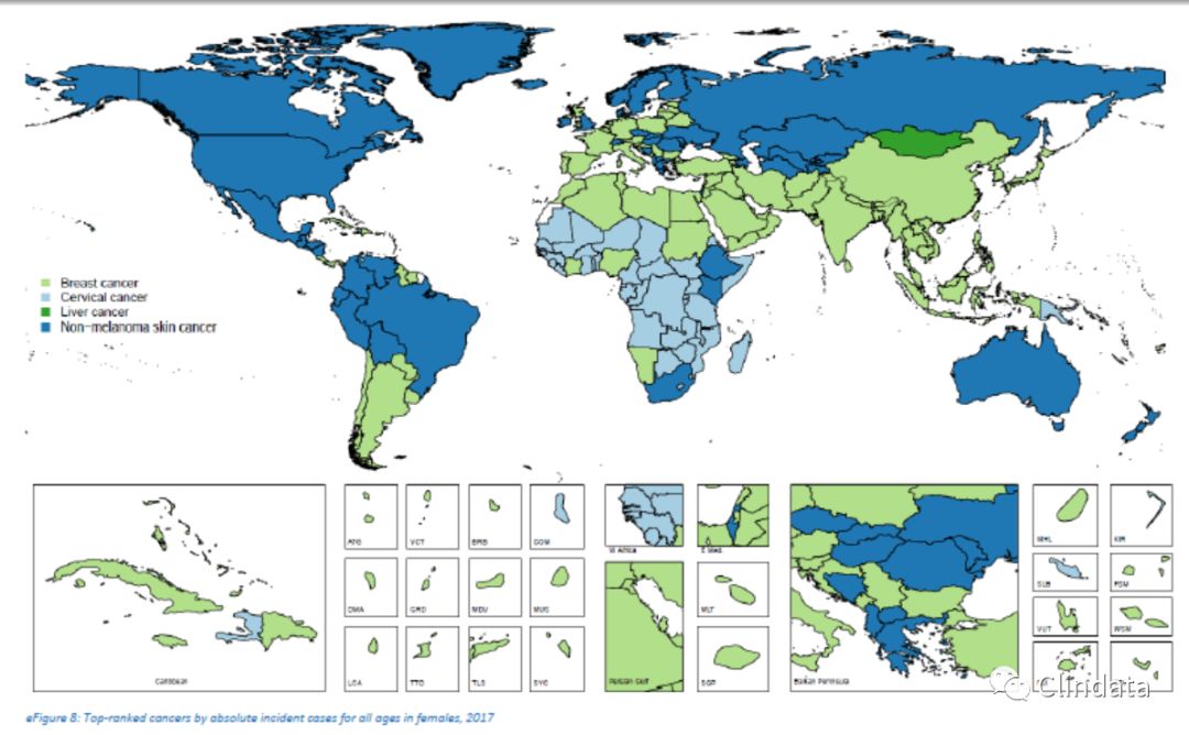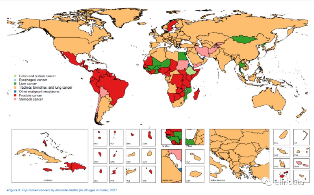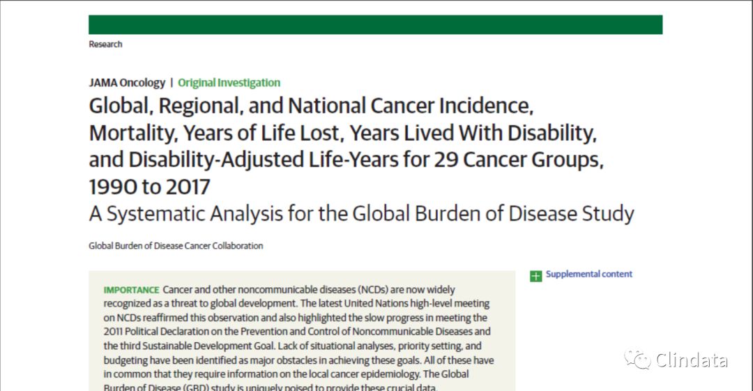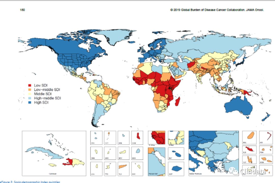 重要性 癌症和其他非传染性疾病(NCD)现在被广泛认为是对全球发展的威胁。联合国非传染性疾病最新高级别会议重申了这一观点,并强调了在实现2011年《关于预防和控制非传染性疾病的政治宣言》和第三个可持续发展目标方面进展缓慢。缺乏情况分析,确定优先重点和预算是实现这些目标的主要障碍。所有这些共同点在于,它们需要有关当地癌症流行病学的信息。全球疾病负担(GBD)研究具有独特的优势,可以提供这些关键数据。 目的 描述1990年至2017年间195个国家的29个癌症组的癌症负担,以提供癌症控制规划所需的数据。 证据审查 我们使用GBD研究估算方法来描述癌症发生率,死亡率,残障生存年限,生命损失年限以及残障调整生命年(DALYs)。结果在国家一级以及社会人口统计学指数(SDI)上进行显示,该指标是收入,教育程度和总生育率的综合指标。我们还分析了流行病学与人口学转变对癌症发病率的影响。 发现 2017年,全球有2450万例癌症事件(1680万例无非黑色素瘤皮肤癌[NMSC])和960万例癌症死亡。大多数癌症DALY来自失去生命的岁月(97%),只有3%来自患有残疾的岁月。男女患低SDI的几率最低(七分之一),高SDI的几率最高(二分之一)。2017年,男性最常见的事件癌症是NMSC(430万起事件);气管,支气管和肺癌(TBL)(150万起事故);和前列腺癌(130万起事件)。男性最常见的癌症死亡和DALY原因是TBL癌(130万死亡和2840万DALY),肝癌(572 000死亡和1520万DALY)和胃癌癌症(542 000例死亡和1220万DALYs)。对于2017年的女性而言,最常见的事件癌症是NMSC(330万事件),乳腺癌(190万事件)和大肠癌(819 000事件)。女性癌症死亡和DALY的主要原因是乳腺癌(601 000例死亡和1740万DALYs),TBL癌(596 000例死亡和1260万DALYs)和结直肠癌(414 000例死亡和830DALYs)。 结论与关联 全国癌症流行病学概况 GBD研究显示出巨大的异质性,这反映了不同的风险因素,经济环境,生活方式以及获得医疗和筛查的机会。政策制定者和其他利益相关者可以使用GBD研究来制定和改善国家和地方癌症控制,以实现全球目标并提高癌症治疗的公平性。Cancer is nowwidely recognized as a global problem that unfortunately lacks a global solution. The latest United Nations high-level meeting on noncommunicable diseases (NCDs) exemplified this conundrum. Despite global commitment to reducing the risk of and disability from NCDs,including cancer, implementation of knownsolutions is inadequate to reach the 2011 Political Declaration on the Prevention and Control of Noncommunicable Diseases(25% reduction in premature mortality from NCDs by 2025) and the third Sustainable Development Goal (by 2030 reduce by onethird premature mortality from NCDs through prevention and treatment, and promote mental health and well-being).To reduce cancer burden, identifying the scope of the problem and mapping out implementation of solutions is best done in National Cancer Control Plans (NCCPs). However, a recent review showed that only 29% of low-income countries had a NCCP, and even if NCCPs existed, cost, financing, monitoring,and expansion of information systems was often inadequate.Many highly effective prevention and treatment strategies exist for cancer.However, they are often very specific (eg,vaccination forhumanpapillomavirus and hepatitisBvirus for prevention of cervical and liver cancer, or tyrosine kinase inhibitors for cancerswith targetablemutations). Effective NCCPs therefore require detailed knowledge about the local burden of cancer and associated risk factors. We herein present results from the Global Burden of Disease (GBD) 2017 study describing cancer incidence, mortality, years of life lost (YLLs), years livedwith disability (YLDs), and disability-adjusted lifeyears (DALYs) for 195 countries from1990 through 2017, which can inform cancer control through policy, resource allocation,and health system planning.癌症已被广泛认为是一个全球性问题,但不幸的是缺乏全球性解决方案。最近的联合国非传染性疾病高级别会议就是这一难题的例证。尽管全球致力于降低包括癌症在内的非传染性疾病的风险和致残性,但已知解决方案的实施仍不足以达成2011年《关于预防和控制非传染性疾病的政治宣言》(到2025年使非传染性疾病的过早死亡减少25%)和第三次可持续发展。发展目标(到2030年,通过预防和治疗将非传染性疾病的过早死亡率降低三分之一,并促进心理健康和福祉)。减少癌症负担,确定问题的范围并规划解决方案的实施最好在国家癌症中心控制计划(NCCP)。然而,最近的一项审查表明,只有29%的低收入国家拥有NCCP,即使存在NCCP,信息系统的成本,融资,监控和扩展也常常不足。许多有效的癌症预防和治疗策略存在但是,它们通常非常具体(例如,人乳头瘤病毒和乙型肝炎病毒的疫苗接种,以预防子宫颈癌和肝癌,或酪氨酸激酶抑制剂用于具有可靶向突变的癌症)。因此,有效的NCCP需要有关癌症局部负担和相关风险因素的详细知识。我们在此提供了2017年全球疾病负担(GBD)研究的结果,该研究描述了1990年至2017年间195个国家的癌症发病率,死亡率,生命损失年限(YLLs),残疾寿命年限(YLDs)和残疾调整生命年(DALYs)。可以通过政策,资源分配和卫生系统规划来告知癌症控制。Methods Methods have remained similar to the GBD 2016 study.Detailed descriptions of the methods can be found in theGBD 2017 publications as well as in the eAppendix, eFigures, and eTables in the Supplement.For eachGBDstudy, the entire time series is re-estimated. This study therefore supersedes prior GBD iterations. The GBD study is compliant with the Guidelines forAccurate and TransparentHeal