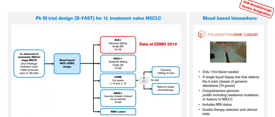 越来越多的证据表明,血液中的生物标志物在晚期非小细胞肺癌(NSCLC)中具有预测作用。进一步探索发现,基于血液的二代测序(NGS)检测在这种情况下指导选择靶向治疗同样具有临床效用。血液中的生物标志物在晚期NSCLC中的表现是2019年ESMO大会上几个报告的主题,今天跟大家分享其中的2个。 在全球II/III期的BFAST研究中,一组基于血液NGS检测(液体活检)的ALK融合阳性NSCLC患者接受ALK抑制剂阿来替尼(Alectinib)治疗后,达到试验主要终点。研究者确认的客观缓解率(ORR)为 87.4%,独立审查机构确认的客观缓解率(ORR)为 92.0%。1 这与在关键III期ALEX试验中基于组织检测的ALK融合阳性NSCLC患者接受ALK抑制剂阿来替尼(Alectinib)所观察到的ORR(82.9%)结果一致。 ▲ 基于血液生物标志物检测的BFAST研究