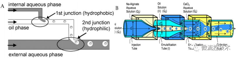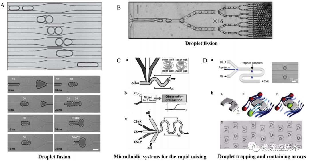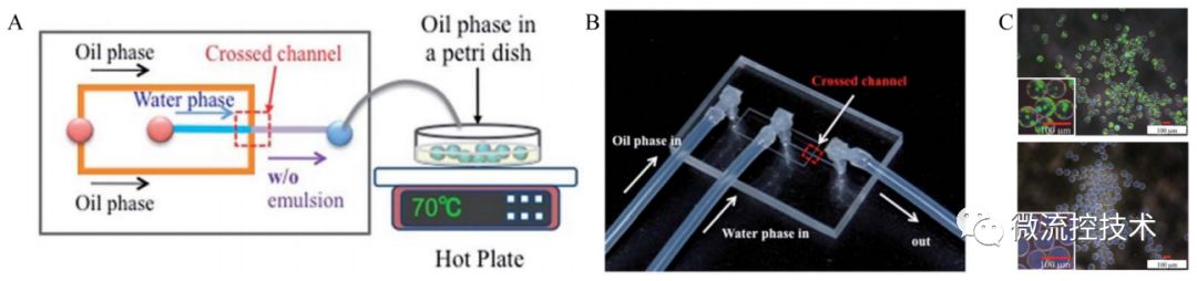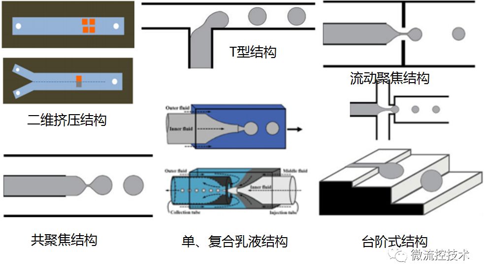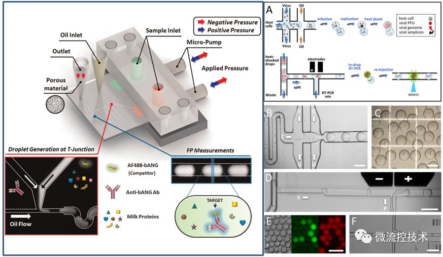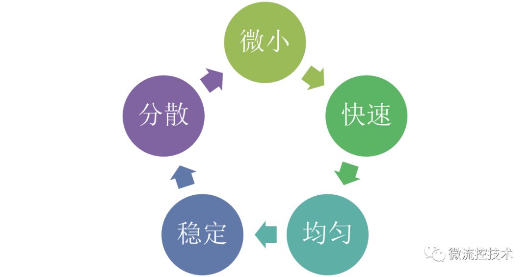 图解液滴微流控技术 微液滴具有体积小、比表面积大、速度快、通量高、大小均匀、体系封闭、内部稳定等特性,在药物控释、病毒检测、颗粒材料合成、催化剂等领域中均有重要应用。微流控技术的发展为微液滴生成中实现尺寸规格、结构形貌和功能特性等的可控设计和精确操控提供了全新平台。 本文还是采用以图片展示为主,结合相关文字讲解,液滴微流控技术的特点,原理以及应用领域。从而帮助大家了解认识液滴微流控技术,并在各自研究领域应用液滴微流控技术。 01 什么是液滴微流控技术 微液滴技术是在微尺度通道内,利用流动剪切力与表面张力之间的相互作用将连续流体分割分离成离散的纳升级及以下体积的液滴的一种微纳技术。 02 液滴微流控技术特点 液滴微流技术特点具有,液滴体积微小,尺寸可达纳升甚至飞升范围,比表面积非常大;液滴依靠微流体技术,可以快速生成大量的液滴;每个液滴大小均匀;液滴之间彼此分离,状态稳定,避免交叉污染;液滴具有很好的单分散性,浓度相同,反应一致。 03 微流控液滴生成方法 基于微流控体系的液滴生成方法中,最常用的有主动式和被动式两种。在主动式中,主要采用诸如光控、电动、磁场和微阀等外场驱动力实现液滴生成。相比主动式而言,被动生成方法无需施加外场作用,直接利用微通道几何结构的限制促使流场交界面发生变形、界面不稳定性增加,从而生成离散相液滴。 被动式微流控液滴生成方法 04 微流控液滴的基本操作 常见微液滴的基本操作主要包括:A 液滴融合;B 液滴分裂; C 液滴内部混合; D 液滴捕获和存储。 05 微流控液滴的应用-材料学方面 微球制作过程 Yang 等利用微流控技术在光聚合作用下合成了直径约为3.3-3.7mm的低密度海绵状微壳,并研究了在光敏聚合作用中单体浓度和照明时间对聚二乙烯基苯微壳结构和性能的影响。发现聚二乙烯基苯微壳的孔隙体积和平均孔隙直径随着单体浓度和照明时间的增加而减少。该研究对实现毫米尺度聚二乙烯基苯微壳的最优化以及激光融合实验或ICF靶目标芯轴的具体应用有重要指导意义。 06 微流控液滴的应用-生物医学方面 液滴微流控技术应用于分子诊断免疫检测和病毒感染性检测 左图为,Jae-Won Choi运用气动微泵装置建立了用于生物标志物液滴微流控荧光偏振免疫分析平台,成功检测牛奶中牛血管生成素的含量。 右图为,Ye Tao研发了一种基于微液滴技术并结合空斑试验和实时定量PCR技术的微流控系统,用于实现对病毒感染性的快速、低成本和高精度定向检测。 经过多年的发展,基于微尺度流体优异的流动操作特性以及微流控系统装配结构的多样性,微流控液滴技术在生命科学及医药分析领域的研究中也发挥了巨大的作用。 07 微流控液滴的应用-食品加工方面 左图为, Okushima等通过包含两个连续T型结构的微通道,利用“两步式”液滴生成法合成了单分散性W/O/W型双重微乳滴,并通过调节内/外部液滴的分裂速率实现对液滴内部包含微乳滴数目的精确调控。 右图为, Ren等采用微流控法合成液滴后,在下游添加交联剂水溶液使得生物高聚物和交联离子在水、油流柱的交界面发生反应实现凝胶化,制备包裹油核的单分散海藻酸盐胶囊。 通过微流控液滴技术可获得微乳滴、固态脂质微颗粒、自组装体以及包含一个或多个内核的微胶囊等多种类型的食品结构。 08 液滴微流控展望 液滴微流控技术近年来发展迅速,为材料学、化学、生命科学与医学等领域的基础与应用研究提供了一个有力平台。然而,液滴微流控技术目前还存在一些挑战,例如不同样品之间的切换、油相和水相中表面活性剂对液滴反应和检测的影响、液滴与液滴之间的相互污染等问题均没有得到较好的解决,理论指导极为缺乏。随着该领域研究的不断深入,这些问题将逐步得到解决,液滴微流控的应用前景也将变得更加广阔。 参考文献: Liu Z M, Yang Y, Yu D U, et al. Chinese Journal of Analytical Chemistry, 2017, 45(2):282-296. Zhou J, Khodakov D A, Ellis A V, et al. Electrophoresis, 2012, 33(1):89-104. Tao Y, Rotem A, Zhang H, et al. Lab on A Chip, 2015, 15(19):3934-3940. Okushima S, Nisisako T, Torii T, et al. Langmuir Acs Journal of Surfaces & Colloids, 2004, 20(23):9905-8. Choi J W, Kim G J, Lee S, et al.Biosensors & Bioelectronics, 2015, 67(2):497-502. |