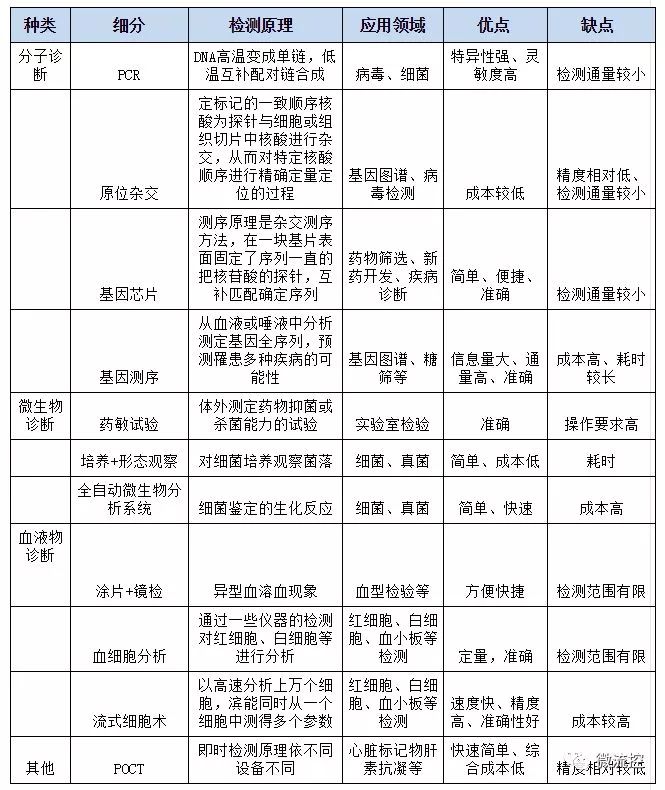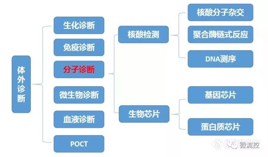 分子诊断在临床诊断中的技术主要包括PCR技术、芯片技术和测序技术。临床检测中,分子诊断越来越受到重视,但市场占比与生化诊断、免疫诊断相比,还存在一定的差距。 目前分子诊断在体外诊断中的主要的应用领域,包括对病毒、细菌等微生物的筛查及定性定量检测,药物筛选及用药分析以及基因早期的分析。在微生物检验检测方面,分子诊断相对于免疫诊断具有一定的优势;基因图谱分析方面,虽然目前相关研究很多,但在该领域应用的临床价值还有待发掘。 分子诊断在体外诊断中的位置 分子诊断和微生物诊断存在一定的关联性,微生物诊断是外部特性分析,而分子诊断则是对内部分子的检测。 表1 分子诊断在体外诊断中的位置 分子诊断主要技术发展的时间轴 早期的分子诊断设备,多为大型集成化设备,包含很多的操作模块。在原理上,早期的设备并无很多创新,主要是将多种手工操作内容自动化和集成化,发展到基因芯片,才有了原理性的突破。1990年提出的人类基因组计划、后来的蛋白组学以及从近期开始的微生物组计划,极大的推动了分子诊断设备的发展。产品方面,较早期时有Affymetrix公司推出的第一块商业化基因芯片。 接下来是PCR仪器的发展。早期的PCR仪器,是简单的DNA解链、复制、复性等过程,除了水浴锅自动化,并没有太多技术含量。数字PCR技术出现后, 与生物信息学和微型加工技术关联起来,发展速度很快。再后来出现了微流控技术和基因测序技术。基因测序技术经历了一代、二代、三代,目前测序技术,仍然是重要的发展方向。 分子诊断主要技术发展的时间轴 前处理复杂导至分子诊断的现场应用成为瓶颈 分子诊断和免疫诊断、生化诊断设备不同的地方,很大程度在于样品前处理。免疫检测对象主要是一些游离的大分子,处理相对容易,但分子诊断样本处在细胞当中,处理过程容易被污染,因此前处理系统相对复杂。 分子诊断系统的组成包括样本前处理系统、检测处理系统和分析处理系统。样本前处理系统依据其功能的丰富程度又包括移液操作和核酸提取两个平台,依据使用场所不同分为实验室自动化平台和现场前处理平台。 目前前处理设备中,全自动的移液工作站是比较成功的设备。它是一种全自动、高精度移液系统,专门用于小体积的PCR、qPCR体系配置,能够完全替代手工,保证了配置实验扩增体系的正确性、精密度及重复性。缺点是功能单一,临床及科研应用尚有一定局限性。 贝克曼自动化工作站Biomek i7 核酸提取设备,主要是自动核酸提取仪,该仪器集成了自动移液工作站和标准耗材,在以其预设程序控制下进行核算分离的仪器,这一类自动化系统在科研和临床中应用最为广泛。提取方法的核心是免疫磁珠,包括磁珠吸附和磁珠分离等。除磁珠提取纯化方法外,还有其他纯化方法,如柱层析法。 托摩根核酸提取仪 MM96 目前,现场分子诊断还存在诸多问题。免疫检测中可用试纸条等材料,检测方便,但是分子诊断没有这类材料可用,主要原因是样品前处理无法达到这种检测目的。当现场检测时,在很开放的环境下,如何提取纯化DNA,目前仍没有简易方法。现场检测的需求,目前在医院的临检中心还不大,对于基层的卫生所,或许会存在这样的需求,从这个问题也引发出医疗模式应该往什么方向发展的思考。 分子诊断的三大检测平台 分子诊断主要的检测平台为PCR仪、芯片系统以及基因测序平台。 PCR仪——数字PCR是未来发展趋势 分子诊断设备另一个重要的组成内容是PCR仪器。常规的PCR目前技术上可提升的空间很有限,但很多部件只有少数几家厂家做的不错。 荧光定量PCR,国内有很多厂家生产,技术、元器件等各方面正在迅速赶超国外仪器厂商水平,但这未必是国内厂商最终的发展方向。得益于光源及检测器件小型化趋势,现在的荧光PCR仪越来越小型化。 数字PCR是PCR领域未来发展的趋势,目前有一些厂商在研究生产,比如锐讯生物、新羿生物、领航基因等。现在数字PCR的售价很高,主要原因是后端检测器件灵敏度要求高,成像器件技术先进,造成成本偏高。当然,因为数字PCR有绝对定量的功能,对于分子检测意义重 微滴式数字PCR的检测流程 表2 3种PCR的比较 DNA微阵列——基因芯片 荧光原位杂交(FISH),是一种传统方法,对于原位切片的分析有一定的意义。仪器本身比较简单,就是荧光显微镜,外加一个壳构成的一个图像分析仪。检测过程是在一定的温度下将切片加入设备中,成像。杂交的另一种方式是利用芯片进行,主要是DNA微阵列芯片。芯片技术从上世纪90初期开始研究到现在,已经有近三十年时间,目前已经应用到诊断当中,用做疾病筛查。荧光原位杂交最核心的地方在于诊断试剂而非设备。目前的检测方式主要采用荧光标记的方式,在灵敏度方面,已经能够满足检测要求,因此化学发光、电化学发光标记方式相对较少。 美谷分子GenePix 4300A&4400A微阵列基因芯片扫描仪 第四代基因测序成为资本追逐热点 基因测序的发展,从最早获得诺贝尔奖的一代,到现在已经发展到第四代。原理上,第一代测序仪可认为是人工操作方法的仪器实现,相对比较简单。现在的第三代测序和第四代测序的原理已有一定区别。目前,高通量测序的需求很大,发展很迅速,国内在基因测序仪器的发展也将会越来越快。第三代和四代测序仪的价值在于直接读取功能大,但