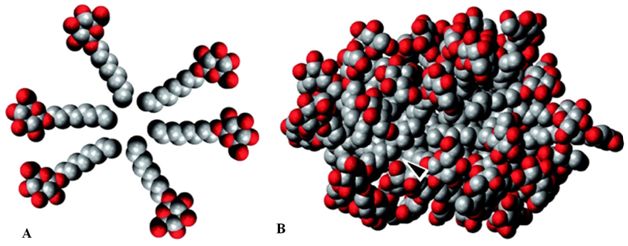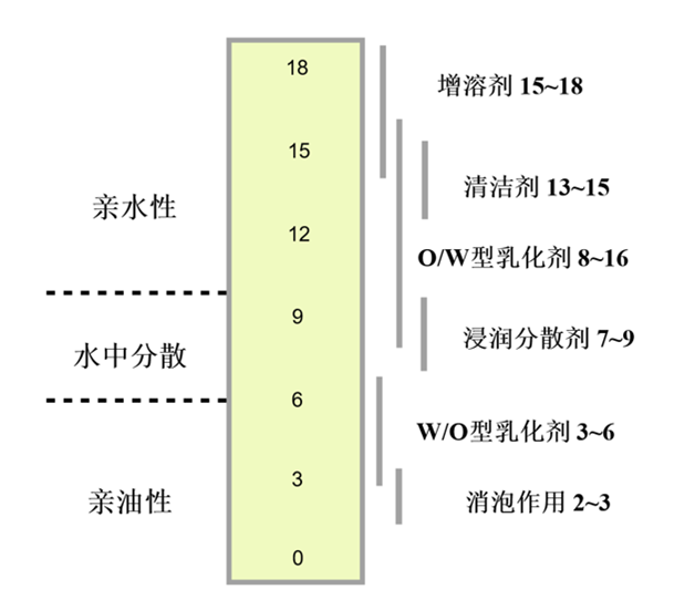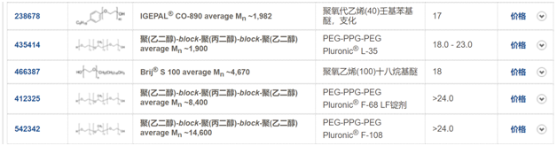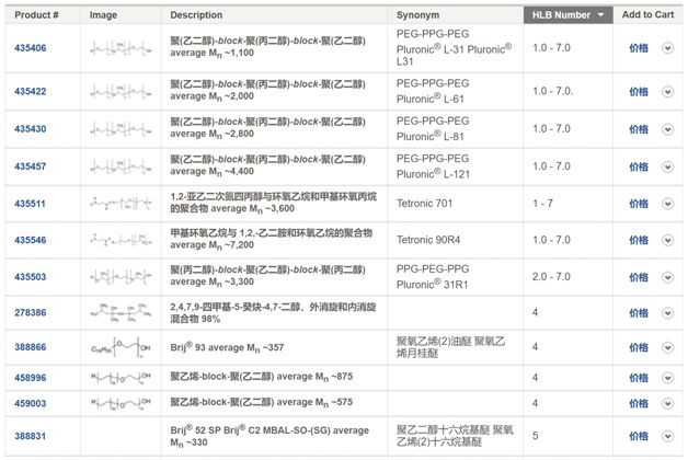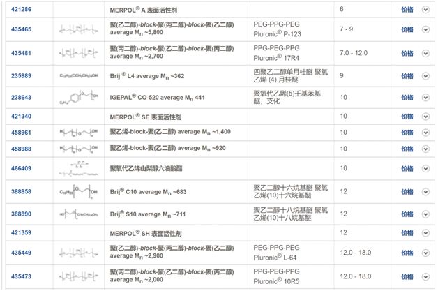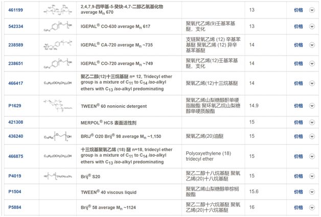 表面活性剂是一类双亲性分子,它包含亲水的极性部分和疏水的非极性部分,非极性部分通常是疏水的烷基链。极性亲水基团能够使表面活性剂以单体的形式溶在水中。但是当水溶液中的表面活性剂达到一定浓度时,单体的表面活性剂通过烷基链的疏水相互作用,形成亲水基团朝外,疏水基团朝内的球形结构,这种结构称为胶束,使表面活性剂在溶液中形成胶束的浓度被称之为临界胶束浓度(Critical Micelle Concentration,CMC)。单表面活性剂浓度达到临界胶束浓度,溶液中单体的表面活性剂浓度不再增加,而自发形成胶束。虽然胶束常被简化为对称的球体,但实际上溶液中的胶束使动态的,极度不规则的形状。临界胶束浓度是表面活性剂最为重要的特性之一,并且对蛋白质-表面活性剂的相互作用有重要的影响,通常单体的表面活性剂与形成胶束的表面活性剂和蛋白质之间的相互作用差别是极大的。值得注意的是,表面活性剂的临界胶束浓度与缓冲液的离子强度有关。溶液中的离子会降低表面活性剂的静电排斥,从而降低临界胶束浓度。例如,常用的SDS阴离子表面活性剂,在水溶液中的临界胶束浓度是7~8mM,但是在PBS缓冲液中则为0.8~1mM。另外,自由胶束的形成,还与溶液中的蛋白质有关,当溶液中存在蛋白质时,会与溶液中的表面活性剂相互作用,降低游离的单体表面活性剂浓度,从而提高表面活性剂的临界胶束浓度。△β-D-辛基葡糖苷胶束,A是由六个单体组成的胶束,B是由50个单体组成的胶束。HLB(Hydrophile-Lipophile Balance)是表面活性剂的亲水-亲油平衡值,是衡量表面活性剂本身的亲水、亲油性强弱的数值。HLB值是一个相对值,范围在0~40之间。作为标准无亲水性的石蜡,其HLB值为0,聚氧乙烯为20,亲水性较强的SDS其HLB值为40。HLB值越高,表面活性剂的亲水性越好,HLB值越接近0,表面活性剂的亲水性越弱。通常非离子型的表面活性剂HLB值为0~20之间;小于10的表面活性剂表现为亲油性,大于10的表面活性剂表现为亲水性,因此,表面活性剂由亲油性到亲水性的转折点为10。△不同HLB表面活性剂的特性和用途,具体常用的表面活性剂HLB值见文末图表。