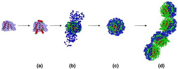 △SDS与蛋白质相互作用的过程,a为结合了三个SDS的蛋白质,未有明显的蛋白质构象变化;随着SDS结合数量增加,在蛋白质表面形成一层类似胶束结构的簇状结构。当离子型表面活性剂浓度增加,超过蛋白质饱和结合位点,进一步结合的表面活性剂将引起蛋白质去折叠,在结合位点形成表面活性簇。此时会有一个浓度窗口期,当表面活性剂不足以让所有蛋白结合位点形成簇状结构,蛋白质之间会通过相互作用,形成几个蛋白质相互连接的结构,导至蛋白质聚集。当表面活性剂浓度进一步增加,每个蛋白质都会形成单独的类似胶束的簇状结构。尽管非离子型表面活性剂对蛋白质作用要温和得多,但是如果超过临界胶束浓度,也有可能引起蛋白质变性。△离子型表面活性剂与非离子型表面活性剂对蛋白质的影响;上图:离子型表面活性剂对蛋白影响可分为两种形式,一种是单体,低浓度下的单体表面活性剂不会引起蛋白质空间构象改变,浓度增高能够引起蛋白变性。另一种是胶束,离子型胶束直接引起蛋白变性;下图:非离子型、双离子型表面活性剂单体一般不会引起蛋白空间构象改变,但是达到胶束浓度后,还是能够影响蛋白质构象。