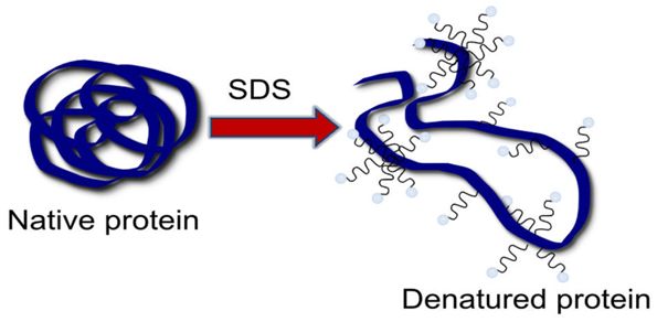 表面活性剂最重要的分类方法是溶解在水中后亲水基团是否带电,基于此方法,可以将表面活性剂分为非离子型表面活性剂(Nonionic),阴离子表面活性剂(Anionic),阳离子表面活性剂(Cationic),以及双离子型表面活性剂(Zwitterionic)。非离子型表面活性剂、双离子表面活性剂在低于临界胶束浓度下都不会引起蛋白质变性。与之形成鲜明对比的是,离子型表面活性剂是强烈的蛋白变性剂,即使是几mM的浓度,也会引起蛋白变性,比传统的化学变性剂如尿素、氯化胍要强1000倍。离子型表面活性剂在溶液中电离产生一个带电基团,与蛋白质带相反电荷的残基通过静电作用相互结合,如阴离子表面活性剂与蛋白质正电残基如赖氨酸、精氨酸、组氨酸结合;阳离子表面活性剂与负电残基结合,如天冬氨酸、谷氨酸。通过静电结合之后,表面活性剂的疏水端再与蛋白附近的疏水位点结合。对于非离子型表面活性剂、双离子表面活性剂两类电中性表面活性剂,在溶液中以相对较弱的作用力与蛋白质结合,如疏水作用力、氢键等,这类相互作用通常不会引起蛋白质构象的强烈改变。表面活性剂与蛋白质的相互作用不但和类型有关,还和浓度相关。同样的表面活性剂在不同的浓度下,引起的蛋白质构象变化程度不一样。如前文说到,离子型表面活性剂是强烈的蛋白变性剂,但是在低浓度下,离子型表面活性剂也能对一些蛋白也能起到增加热稳定性的作用。日本学者发现,少量的SDS存在,能够有效增强BSA的热稳定性,并且烷基链越长,保护作用越显著。BSA在体内主要作用之一是运输双亲性分子、疏水小分子等,天然状态下的BSA有12个磺酸酯结合位点,当一个BSA结合的SDS数量为12个(最大15个)时,SDS能够起到稳定作用。当结合SDS数量超过15个,BSA开始趋向于去折叠结构,从而暴露更多的结合位点,导至蛋白构象进一步不稳定。不同蛋白天然状态下可结合的SDS数量不一样:β-乳球蛋白含有1个结合位点;α-螺旋牛酰基辅酶-A结合蛋白(ACBP)能够结合1-3个SDS;α-乳清蛋白能够结合3-4个SDS情况下不变性。但是低浓度下的SDS并不总起维持蛋白稳定作用,如肌红蛋白,即使只结合一个SDS,也能够导至蛋白极其不稳定。