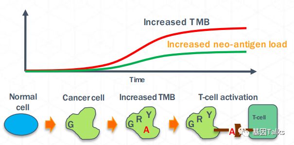 | TMB,Tumor Mutation Burden,即肿瘤突变负荷,是一种可定量的生物标志物,用来反映肿瘤细胞中所含有的突变数目,通常用肿瘤细胞基因组编码区的每百万碱基突变数来衡量,即 每Mbp CDS 上检出的突变数目,表示为:X muts/Mbp。TMB与新生抗原呈正相关,这也正是TMB能作为免疫检查点抑制剂生物标志物的一个重要原因。下图中红色A为免疫原性突变,黑色的G为非免疫原性突变。