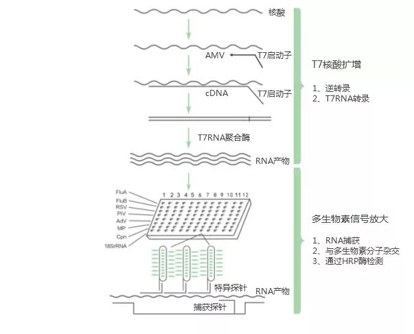 双扩增法由武汉中帜生物采用,具体原理如图所示。其具有下列三个特点:1、无需PCR扩增靶分子,通过多生物素分子聚合体对待检测靶分子进行信号放大,提高检测灵敏度至几个靶分子。2、无需对核酸分子进行模板指数性扩增,降低假阳性率。3、无需核酸提取,细胞裂解后直接进行检测分析,方法简便。