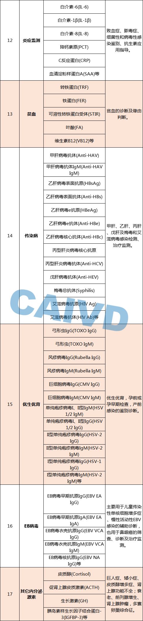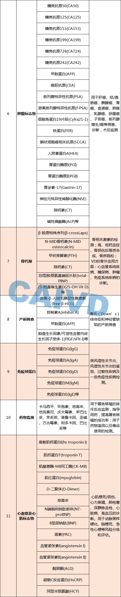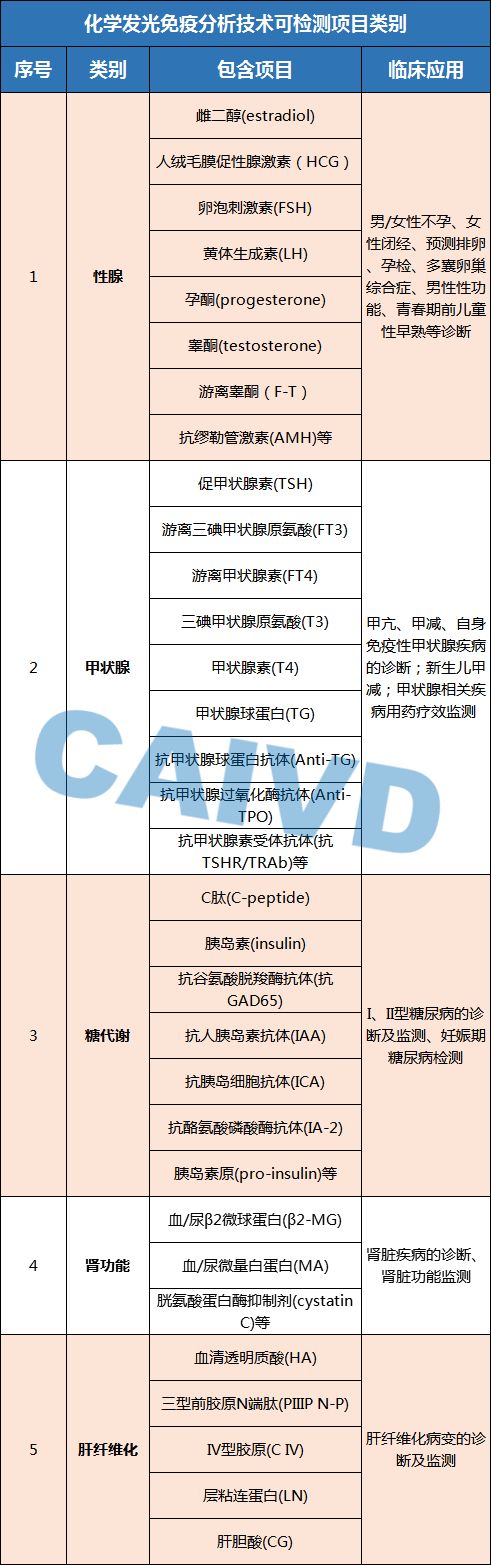 化学发光免疫分析技术 (chemiluminescence immunoassay, CLIA) 起步于20世纪80年代初,快速发展于20世纪90年代,成为继荧光免疫技术、放射免疫技术及酶联免疫技术后发展的一项新兴免疫检测技术。化学发光免疫分析技术是利用化学反应释放的自由能激发中间体,使其从激发态回到基态,当中间体从激发态回到基态时释放等能级的光子,再对光子进行测定而进行的定量分析技术。化学发光免疫分析技术主要具有灵敏度高、特异性强、试剂稳定性好且有效期长、检测线性范围宽、操作简单、方法稳定快速、检测项目多(如下图)、自动化程度高等优点,该技术已成为目前免疫分析技术的主流方法,广泛应用于临床检验的各个领域。