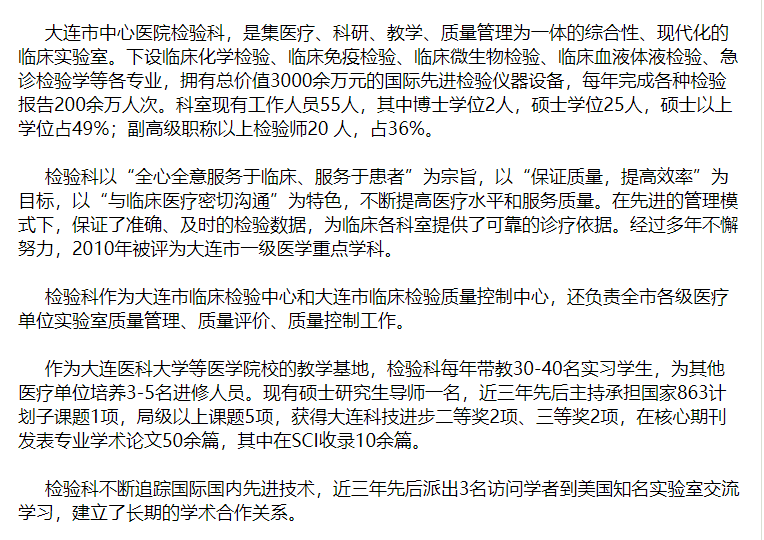 摘要: 大连市中心医院检验科,是集医疗、科研、教学、质量管理为一体的综合性、现代化的临床实验室。下设临床化学检验、临床免疫检验、临床微生物检验、临床血液体液检验、急诊检验学等专业。