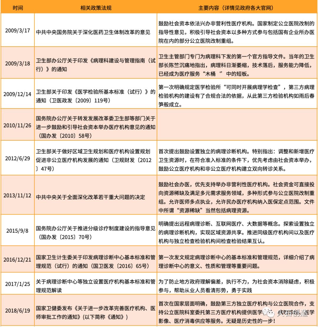 病理学在整个西医体系中是一门非常重要的学科,国外通常将病理学称为"医学之本",病理医师称为"医生的医生"。病理诊断是通过对活检组织、尸体剖检和脱落细胞等进行形态观察,直接用于临床疾病的诊断,是对临床诊断的监测和补充,在医疗实践中占有重要地位。就患者而言,病理诊断结果关乎其后续治疗方案的选定。培养一个合格的病理科医生很不容易,临床医学本科毕业后一般需要住院医师规范化培训,获得从业病理医师的资格,再经过大型医院病理科10年左右的临床病理诊断实践,才能独当一面完成常见疾病的病理诊断。“临床医学亚专业越来越细化,治疗方案越来越精准,这首先就要求疾病分类、分型的病理诊断必须精准,可是我国病理医师总数量太少,远远不能满足临床需求”, 中国科学院院士、中国医师协会病理科分会会长卞修武说,目前全国有执照的病理科医生不足2万人,按照国家卫健委每100张病床配备1~2名病理科医师的配置要求计算,病理医生缺口超过9万人。随着临床治疗工作向着个性化的精准医疗方向发展,病理诊断也正面临着从单一的形态学诊断向着集形态诊断、分子分型、免疫组化中和诊断模式转变。这样就要求,病理科在建设初期需要投入巨资购买大型设备,而对于一些基层医院而言,出于成本效益的考虑,往往不能及时更换、添置最新仪器设备,进而影响诊断质量,并成为新技术开展的一个瓶颈问题。病理诊断中心已成为医改热点之一。国家从2009开始陆续推出各项政策,促进病理行业的发展。表1 我国相关国家政策盘点