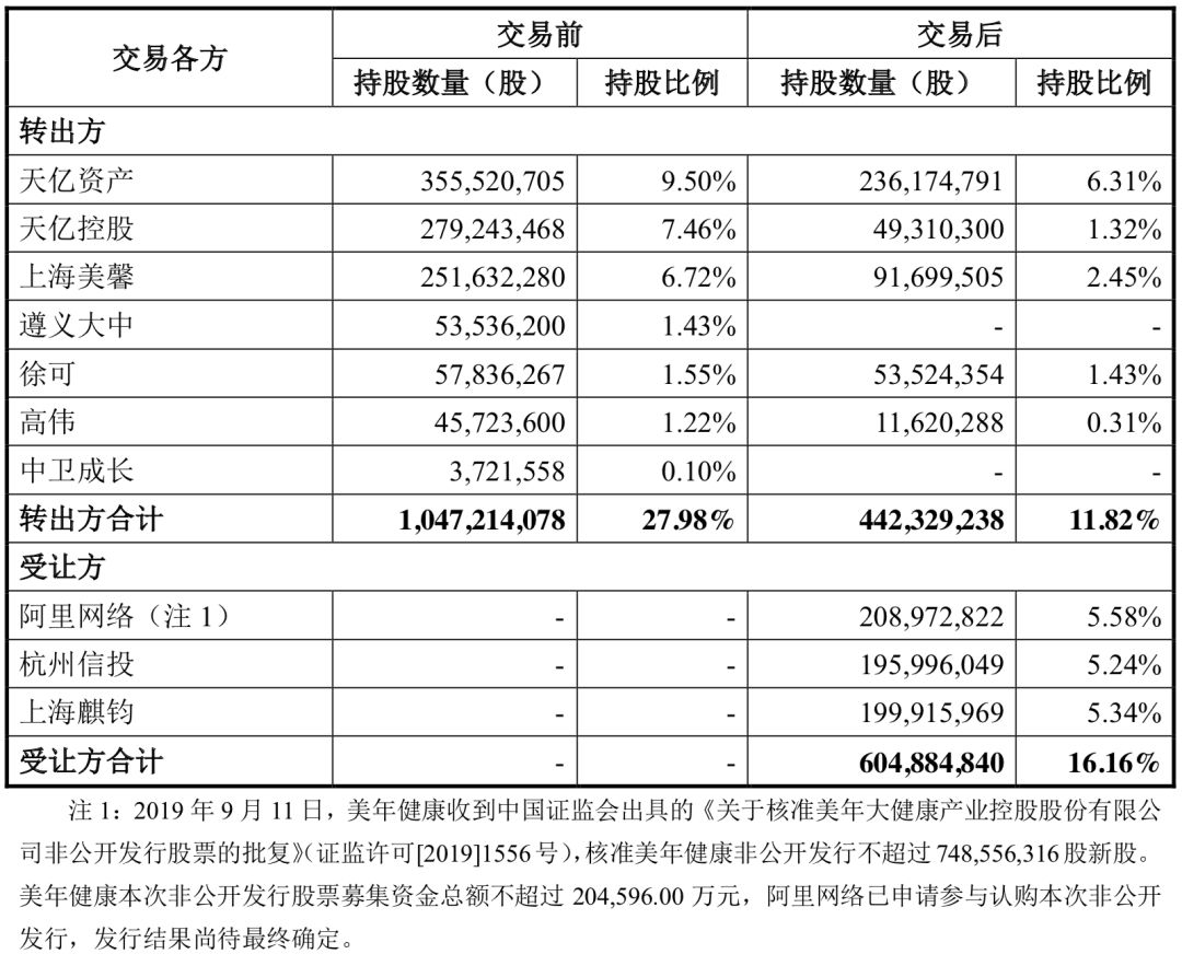 | ▲美年大健康产业控股股份有限公司关于控股股东及其他股东签署《股份转让协议》暨权益变动提示性公告(来自:美年健康)10月27日晚间,美年大健康产业控股股份有限公司(以下简称“美年健康”,股票代码:002044)对外发布公告:公司控股股东——上海天亿资产管理有限公司(以下简称“天亿资产”)、与一致行动人以及其他股东——上海天亿实业控股集团有限公司(以下简称“天亿控股”)、上海美馨投资管理有限公司(以下简称“上海美馨”)拟向阿里巴巴(中国)网络技术有限公司(以下简称“阿里网络”)、杭州信投信息技术有限公司(以下简称“杭州信投”)、上海麒钧投资中心(有限合伙)(以下简称“上海麒钧”)分别转让美年健康5.58%、5.24%、5.34%股份,转让价格均为12.01元/股。至此,阿里网络、杭州信投与上海麒钧将合计持有美年健康16.16%股份。阿里网络和杭州信投作为一致行动人,将成为美年健康的第二大股东。据了解,此次交易前,美年健康控股股东为天亿资产,共计持有355,520,705股股份,占股9.50%,俞熔先生及其一致行动人合计持有上市公司1,407,586,139股股份,占股37.61%,俞熔先生为美年健康的实际控制人。交易后,天亿资产持有上市公司236,174,791股股份,占股6.31%,仍为上市公司的控股股东,俞熔先生及其一致行动人合计持有上市公司 856,237,499 股股份,占股22.88%,俞熔先生仍为上市公司的实际控制人,此次交易不会造成美年健康控制权发生变化。▲此次交易后,美年健康股权结构情况(来自:美年健康)▲美年健康权益变动前后转让各方持股情况(来自:美年健康)具体来看,美年健康股东天亿控股、上海美馨、遵义市大中企业管理有限公司(以下简称“遵义大中”)与阿里网络签署《股份转让协议》,约定转让方将其合计持有的上市公司股份2.09亿股(占公司总股本5.58%)转让给阿里网络。转让价格确定为12.01元/股,转让总价为人民币25.1亿元。▲此次交易前后,美年健康权益变动情况(来自:美年健康)美年健康控股股东天亿资产、天亿控股、上海美馨、高伟、徐可、遵义大中与杭州信投签署《股份转让协议》,约定转让方将其持有的上市公司股份1.96亿股(占公司总股本5.24%)转让给杭州信投。转让价格确定为12.01元/股,转让总价为人民币23.54亿元。天亿资产、中卫成长(上海)创业投资合伙企业(有限合伙)(以下简称“中卫成长”)、上海美馨、高伟与上海麒钧签署《股份转让协议》,约定转让方将其合计持有的上市公司股份2亿股(占公司总股本5.34%)转让给上海麒钧。转让价格确定为12.01元/股,转让总价为人民币24.01亿元。值得注意的是,相比美年健康10月25日13.61元/股的收盘价,12.01元/股的转让价格折价11.76%。