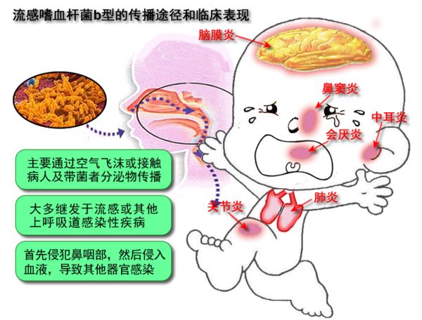 流感嗜血杆菌是造成儿童和某些具慢性肺部基础疾病或免疫机能低下的成人感染的常见病原体。感染经打喷嚏、咳嗽或接触感染患者传播。其中B型流感嗜血杆菌常导至严重感染。B型流感嗜血杆菌(Hib)在儿童可经血液途径传播(引起菌血症)并造成关节、骨骼、肺部、面颈部皮肤、眼、泌尿道和其他器官感染。