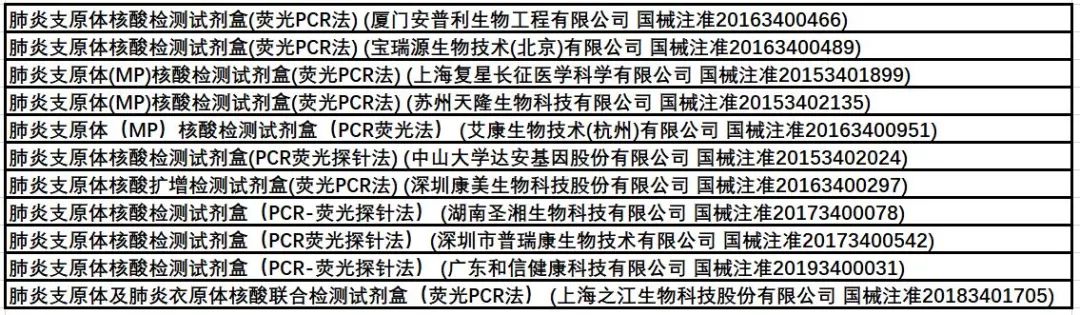 由于支原体在光镜下是看不到,培养也比较困难,实验室诊断可依靠DNA探针或抗原、抗体检测。一些公司的多重呼吸道病原体检测可用于肺炎支原体检测。在NMPA以“肺炎支原体”为关键词进行检索能够检索到188条记录,排除培养基、生化药敏试验卡及过期的试剂盒,共有74个试剂盒。具体如图所示:
