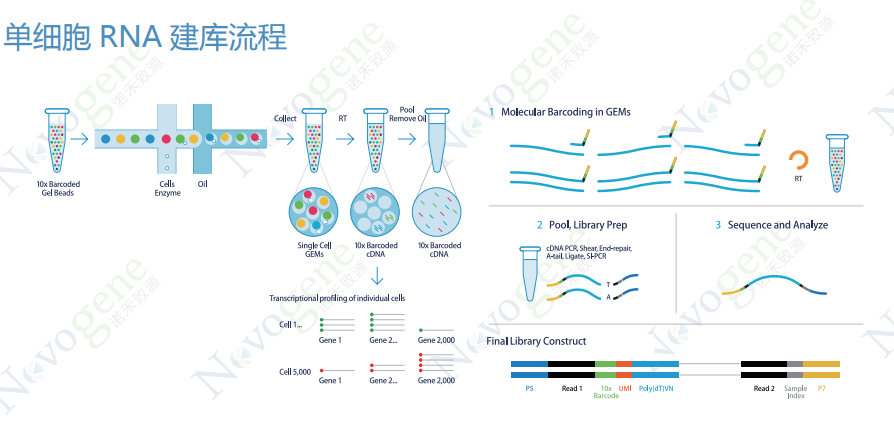 谈到微滴技术不得不跟大家再分享下最近在单细胞测序领域比较火的10X Genomics公司,他们主要是基于微流控液滴技术的建立的一个高通量单细胞转录组测序建库平台,前阵子10X Genomics和Bio-Rad有专利冲突的也正是由于droplet技术中的部分技术因素原因,所以目前他们开发了一种新的创造液滴的手段,但是本质原理是应该没有变化的。主要由两个核心技术组成除了下图中油包水滴的微反应环境的创建,还有创新性的巧妙在样品单细胞分离同时做Barcoding技术。 图3 基于微液滴技术的高通量单细胞转录组测序建库平台