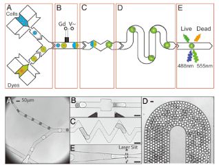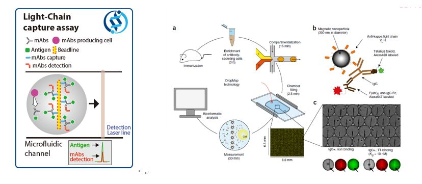 2019年10月22日,Biogen与日本Eisai宣布,经与FDA协商,计划于2020年初向FDA提交Aducanumab治疗阿尔兹海默症(AD)的上市申请。如果获批,Aducanumab将成为首个逆转疾病进展的AD药物。从技术角度看,Aducanumab也将有可能成为首个单B细胞测序来源的抗体药物。正如Aducanumab一样,越来越多的处于研发阶段的抗体候选药物来自单细胞技术。不仅仅是药物研发,在科学研究上随着科学家对于复杂生命体和生命现象的研究日趋深入和细化,他们也不再满足于仅仅研究细胞均一群体拿到细胞之间共性的均一化数据,而是越来越重视同一细胞群体内单个细胞之间的差异性认识和理解,从而帮助我们对从宏观到微观的生物学调控过程和机制有更为精准和深刻的认识。因此可以说当前单细胞层面的研究在生命科学各个领域、各个层面都逐渐成为重要的研究模式。 单细胞研究的发展趋势 从技术角度来看,单细胞研究检测平台通常需要同时结合细胞分离技术和单细胞分泌物分析检测技术,尤其是第一步单细胞分离的操作方法因不同的研究需要而有所区别。常规对于能够确定分选所涉及的标志物以及标志物能够被直接检测的情况,一般利用流式分选技术FACS即可实现大量细胞和复杂样本的单细胞分选,并且通量较大(可做到384孔板),但是有所顾忌的是高速高压的流式分选环节对细胞活性会造成的影响以及FACS并不具备操控某个特定目标细胞或者动态跟踪观察单个细胞的能力,至于其他的单细胞分离分析的方法,例如显微成像、毛细管电泳等,具备精准分析单细胞的组分和结构的优势,但是检测通量却较低。 因此,一种新型单细胞分离技术的开发,希望他不仅能够兼顾在分离后检测灵敏度,检测时长,通量,样品消耗量等难题的克服,而且可满足实时动态追踪单细胞活动信息,实现微量人体细胞样品的单细胞分选及分析检测成为当前紧迫的任务和挑战。微流控技术是指使用微米级别的流体通道精确操控微升、毫升级别体积样品的技术。这种结合微流设备和芯片的的微流控技术在经过很长时间的发展和改进,已实现商业化运用。目前主流且商业化主要是微流控技(Lab-on-a -Chip) 的单细胞平台。今天小编将主要介绍两种主流的微流控技术包括液滴技术Droplet及微反应室技术Microchamber的单细胞技术平台。 微流控之Droplet液滴技术 基于微流控的液滴生成技术(图1)是通过水溶液和油相从不同的微通道中流出并融合,形成一个“油包水”的乳液滴。将液滴技术运用到单细胞分离技术中即将单个细胞、反应试剂等通过微滴生成装置包被在一个油滴中形成油包水的单细胞微反应体系,从而满足多种单细胞的研究需求。 图1 液滴分离技术流程图。A 样品导入模块:包含有细胞以及荧光染料等试剂的两路独立管道;B 细胞及荧光染料等试剂融合模块;C 细胞和荧光试剂的液滴混合模块;D 细胞与染料试剂充分接触和作用模块;E液滴进入检测器检测分析模块 关于微流控液滴技术,目前市场上的代表产品有HiFiBiO的自动化细胞发现平台CelliGO以及英国Sphere Fluidics公司的Cyto-Mine单细胞分析系统等。一般是通过微液滴技术将抗体分泌的B细胞包封在含有生长培养基的液滴中,当单细胞在单个微滴中分隔时,确保单克隆性,并且捕获其分泌的分子如抗体以及和一些荧光二抗提前混合入微滴内,可以进行包括蛋白质分泌速率,滴度和抗原特异性等测定,应用在单细胞基因组测序和重组免疫球蛋白表达,抗体发现、细胞系开发等领域。 如图2所示,小鼠免疫后分离和富集抗体分泌的B细胞,并使用微流控装置将其分成一个个40pl的液滴。液滴来源于两路水相,一路包含细胞或校准抗体,另一路包含有磁性纳米粒子和荧光标记检测用试剂。创建后,液滴被加载成二维阵列形式静置到一个观察腔室中,开始为IgG的分泌以及亲和力分析测定准备。每个微滴中包含有预先涂有抗小鼠kappa轻链VHH的磁性纳米颗粒,它可以将抗体捕获到beads上,最终因为亲和力的作用,抗原蛋白(绿色)以及红色荧光二抗IgG(Fc)都会与beads上包被的固定抗体的IgG片段结合从而实现检测。 图2 Droplet微液滴技术在抗体发现中的应用原理及流程
