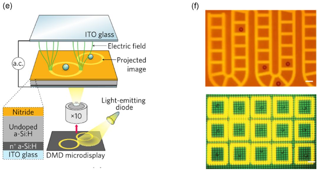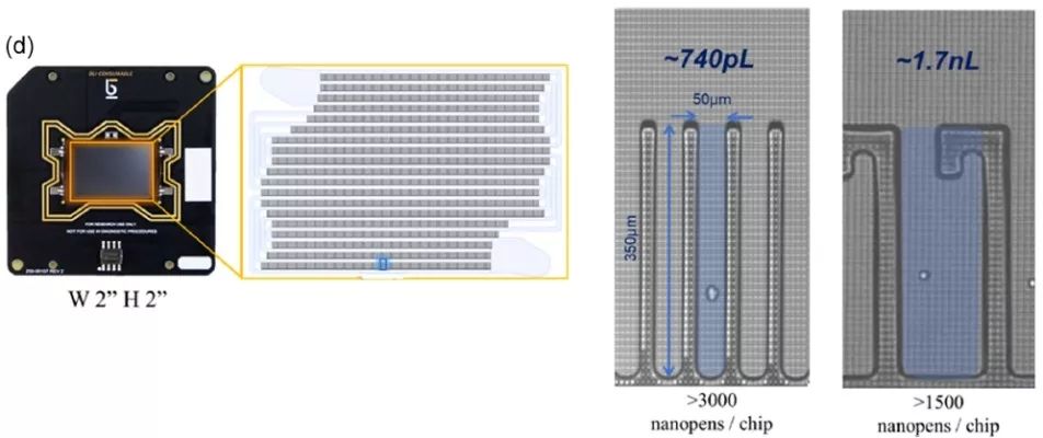 10X Genomics创立之初,是为了解决当时二代测序读长过短的难题,所以最初的技术原型,是将10kb左右的DNA片段,通过这个微流控混合的设计,分配到各个液滴中去。各个液滴悬浮在油环境中,互不干扰,形成成千上万个平行的反应微体系。在每个液滴中含有能够捕获DNA的Gel Bead,上带有相同的长为16bp的Barcode,以及10bp左右,序列随机的UMI(Unique Molecular Identifiers),用于标记每一段起始的DNA或RNA模板。从而判断在测序中测得的相同序列,是来自于建库过程中的PCR扩增产物,还是不同的RNA/c-DNA模板,也就是消除PCR bias,这些对于基因表达量的量化统计至关重要。在测序完成后,可以判断所有带有同样Barcodes的序列,都来自于同一油滴(即同一个最初的10KB片段)。由此可见,10X Genomics本质也主要是对大量细胞的单细胞测序建库准备。平台本身无法直接对细胞的表型进行筛选,主要还是依赖于Cell Sorter平台。 以上这些基于微流控的液滴技术成本低、消耗样品及试剂量少,适合于需要将单细胞和其他所有参与的试剂提前独立包裹在微滴中进行单细胞分离及分析,并不适合特定单细胞的长时间实时观察分析相关的研究。 微流控技术之微反应室Microchamber 传统的微反应室技术像Fluidigm公司的C1系统是在快速自动分理处单细胞并分配到微流体芯片上的单个制备仓中,跟10X相似的是C1主要还是应用在单细胞测序的建库处理流程中,这里就不详细介绍了。 美国Berkeley Lights(BLI)的纳米光导流体平台Optofluidic Platform是结合微流控的纳升级微反应器技术 (Nano-Pen) 、光电定位技术(OEP)以及计算机系统的一体化完成单细胞分选、分析、培养以及导出功能的多功能单细胞平台。在BLI平台承载微流控体系的是其核心OptoSelect芯片。该芯片是一个精细的、集约化的、细胞运输和培养功能兼而有之的流体管路系统,由纳升级培养小室Nano-Pen和微流管道构成。微流系统可实现单细胞的运输,而通过加以特殊外力即可实现向Nano-Pen中分选入单细胞;这种特殊外力作用便是OEP技术。 图4 OptoSelect芯片的构造及Nano-Pen形状大小