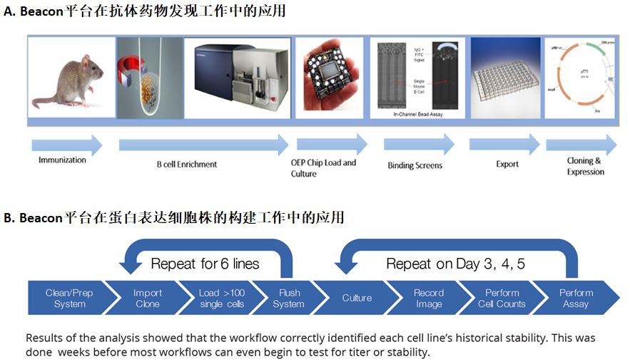 OEP的前身是2018年诺贝尔物理学奖获得者之一的Ashkin发明的Optical Tweeszer(OET)光镊技术,其原理是利用单个激光束通过高倍的显微物镜聚焦形成光阱,微观粒子受光压而束缚在光阱处,使用皮牛级别的力操纵和移动陷入光阱的微观粒子。这项技术在生物学上为单细胞的高分辨实验研究提供了强有力的工具,不过它被限制在需要较高强度的激光强度,且难以同时操作多个细胞要求上,此外,高的光源能量强度也会导至损坏细胞以及限制了实验持续时间。为了克服这些局限,新的光电定位技术 OEP被研究开发了出来,通过OEP技术,利用光束同时在光敏感材料上产生电势场,它能够同时并且大量的操控单细胞,并且OEP允许较低的光源能量,可以在更大的处理面积进行实验。这一技术需要光学器件和配套的芯片组件的结合来完成,如下图所示: 图5 BLI Optofluidic Platform中所使用的OEP技术原理 整个OEP部件由光学系统和光敏感材料组成。光源经过透镜选择性地照射到目标位置。入射光在基于氢化硅的光导电极作用下,在照射部位的上方空间产生局部的电场,产生电场力。通过调整入射光的位置,推动该位置的颗粒(如细胞)移动。这种光电定位OEP技术配合微孔外的微流,即可实现不依赖于荧光染料标记的活细胞定向分选和收集到纳升级培养小室Nano-Pen中。 更可喜的是,Nano-pen中在提供单细胞分选和在线分析的同时也提供单细胞培养所需的环境。最终该核心芯片被仪器的硬件系统集成到一个自动化样本库大小的设备中,包括供电系统、空气和CO2的供应管路、以OEP为基础的定位系统、放置芯片的卡槽及配备的温控培养系统、用于细胞运输和液体交换的微流控系统等。除此之外,还有检测系统的软件部与硬件相配套,用于通过对仪器部件的操作来运行实验和通过对检测元件的操作来实现特定数据的收集。因此BLI技术平台的工作流程大致是:第一步,单细胞的运输和OEP向纳升级培养小室Nano-Pen中的分选;第二步,单细胞的选择性培养;第三步在线On-Chip分析;第四步,特定Nano-Pen中的细胞输出。其中的第三步,即在线检测实验,与特定课题或项目的要求相匹配,可灵活设计,这也是该技术平台的普适性的重要体现。 Berkeley Lights单细胞光流体平台的应用 目前BLI的单细胞光导流体平台强大的功能具体应用的领域包括抗体发现、细胞克隆筛选、细胞系构建、细胞治疗研究等,具有广阔的应用前景。下图给大家展示的是应用于抗体药物发现和抗体表达细胞株构建的工作流程。 图6 BLI技术平台在抗体发现和稳转细胞株构建方面的应用