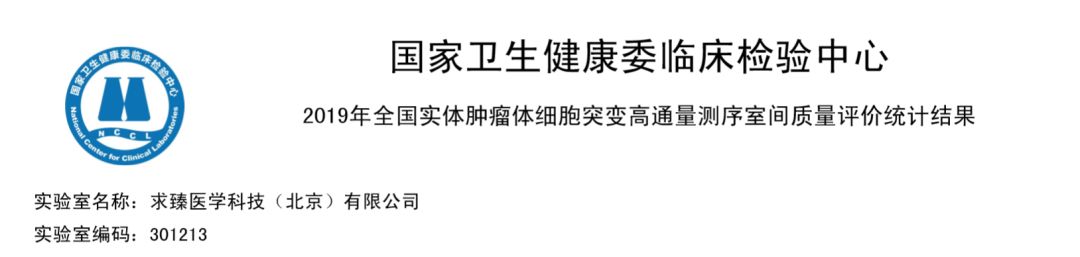 国家卫生健康委临床检验中心(NCCL, National Center for Clinical Laboratories)近日公布了《2019年全国实体肿瘤体细胞突变高通量测序检测室间质量评价》结果。全国实体肿瘤体细胞突变高通量测序检测室间质量评价计划,由国家卫生健康委临床检验中心(NCCL)组织筹划,旨在保证各临床实验室检测质量。该项室间质量评价计划可以确定参评实验室实体肿瘤体细胞突变高通量测序检测的能力,发现在检测过程中存在的问题,促进实验室提高检测水平。 本次室间质评由国家卫生健康委临床检验中心(NCCL)组织并实施。旨在保证个临床实验室检测的质量,该室间质量评价计划可以反映参评实验室实体肿瘤体细胞突变高通量测序检测的能力,促进实验室提高水平。本次能力验证我国共有来自20个省(市、自治区)的共184家实验室参加,共有165个实验室回报了结果,其中仅有90家实验室满分通过了质量检测(54.5%)。 部分满分实验室(排名不分分先后) 一、世和基因 二、求臻医学 三、泛生子医学检验四、金域医学五、北京吉因加