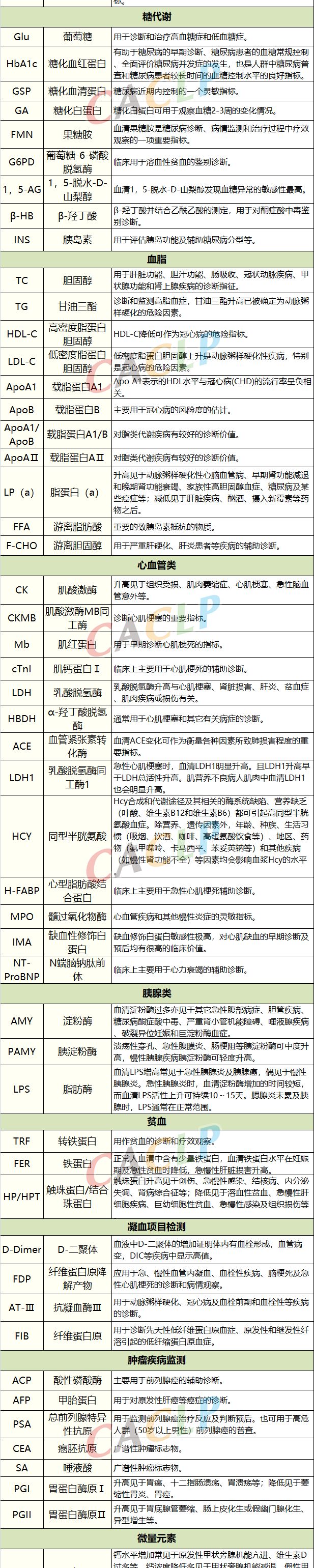 临床生化是在人体正常生物化学的基础上,研究病理状态下生物化学的改变,通过分析相关代谢物的变化,寻找特征性标志物,建立相应的检测方法,为疾病预防、诊断、治疗和预后提供生物化学信息和决策依据。 生化诊断是指利用Lamber-Beer定律,通过各种生物化学反应在体外测定各种无机元素、蛋白和非蛋白氮以及酶、糖、脂等生化指标的体外诊断方法,我们常用的肝功能、肾功能、血糖、血脂等检查项目就属于生化诊断。临床生化诊断试剂与生化分析仪结合起来使用,应用化学、酶学、免疫学等相关技术原理,诊断人体相关的临床生化指标。通过试剂与相关待测物的特异反应,给出特定的光学信号,由生化仪记录,与校准品进行比较给出相关待测物的水平。生化诊断是目前最常用的体外诊断方法之一,也是国内外发展最早、最成熟的IVD细分领域。 一 生化诊断试剂分生化诊断是最早实现自动化的检测手段,也是目前最常用的体外诊断方法之一,常用临床生化试剂有以下几种分类方式: 按临床性质分类 1、肝功能检测项目: 丙氨酸氨基转移酶(ALT)、天门冬氨酸氨基转移酶(AST)、碱性磷酸酶(ALP)、γ-谷氨酰转移酶(γ-GT)、胆碱脂酶(CHE)、总胆红素(TBIL)、直接胆红素(DBIL)、总胆汁酸(TBA)、谷氨酸脱氢酶(GLDH)、腺苷脱氨酶(ADA)、5’-核苷酸酶(5’-NT)、α-L-岩藻糖苷酶(AFU)、前白蛋白(PA)等。 2、肾功能检测项目: 尿素(Urea)、尿酸(UA)、肌酐(CREA)、胱抑素C(CYCS)、α1-微球蛋白(α1-MG)、β2-微球蛋白(β2-MG)、视黄醇结合蛋白(RBP)、尿总蛋白(UTP)、尿转铁蛋白(UTRF)、尿微量白蛋白(MALB)等。 3、糖代谢检测项目: 葡萄糖(Glu)、糖化血红蛋白(HbA1c)、糖化白蛋白(GA)、果糖胺(FMN)等。 4、血脂检测项目: 胆固醇(TC)、甘油三酯(TG)、高密度脂蛋白胆固醇(HDL-C)、低密度脂蛋白胆固醇(LDL-C)、载脂蛋白A1(ApoAⅠ)、载脂蛋白B(ApoB)、脂蛋白(a)(Lp(a))、载脂蛋白E(APOE)等。 5、心血管疾病检测项目: 肌酸激酶(CK)、肌酸激酶同工酶(CKMB)、肌红蛋白(Mb)、肌钙蛋白(cTnI)、同型半胱氨酸(Hcy)等。 6、胰腺疾病检测项目: α-淀粉酶(AMY)、胰淀粉酶(PAMY)、脂肪酶(LPS)等。 7、微量元素: 钙(Ca)、氯(Cl)、镁(Mg)、无机磷(P)、二氧化碳(CO2)、锌(Zn)、铁(Fe)等。 8、免疫性检测项目: 免疫球蛋白G(IgG)、免疫球蛋白A(IgA)、免疫球蛋白M(IgM)、补体C3(C3)、补体C4(C4)、免疫球蛋白D(IgD)、C反应蛋白(CRP)、超敏C反应蛋白(HS-CRP)、免疫球蛋白E(IgE)等。 9、其他检测项目: 乳酸(LA)、卡马西平(CRA)、乙醇(ALC)等。 按化学性质分类1、酶类: 丙氨酸氨基转移酶(ALT)、天门冬氨酸氨基转移酶(AST)、碱性磷酸酶(ALP)、γ-谷氨酰转移酶(γ-GT)、胆碱脂酶(CHE)、谷氨酸脱氢酶(GLDH)、腺苷脱氨酶(ADA)、5-核苷酸酶(5’-NT)、α-L-岩藻糖苷酶(AFU)、肌酸激酶(CK)、肌酸激酶MB同工酶(CKMB)、α-淀粉酶(AMY)、胰淀粉酶(PAMY)、脂肪酶(LPS)等。 2、底物代谢类: 胆固醇(TC)、甘油三酯(TG)、高密度脂蛋白胆固醇(HDL-C)、低密度脂蛋白胆固醇(LDL-C)、尿酸(UA)、葡萄糖(Glu)、总蛋白(TP)、总胆红素(TBIL)、直接胆红素(DBIL)、二氧化碳(CO2)等。 3、无机离子类: 钙(Ca)、氯(Cl)、镁(Mg)、无机磷(P)、锌(Zn)、铁(Fe)等。 4、特种蛋白类: 免疫球蛋白G(IgG)、免疫球蛋白A(IgA)、免疫球蛋白M(IgM)、补体C3(C3)、补体C4(C4)、免疫球蛋白D(IgD)、载脂蛋白A1(ApoAⅠ)、载脂蛋白B(ApoB)等。 二 生化诊断试剂技术临床生物化学方法的进展主要源于生物化学、分析化学等基础研究及电子计算机等高新技术的发展。临床生物化学已从过去的手工滴定、化合物颜色反应进入一个全新的自动化微量分析时代。主要使用的生化试剂技术有: 1.生化分离与分析技术近20年来生化分析发展快速。光谱技术已从单一的比色法发展为分光光度法、透射比浊法、原子吸收和火焰发射光谱法、分子荧光光谱法。分离技术除了一般的离心和超离心技术外,在层析和电泳技术方面有更广泛的发展和应用。层析技术如薄层层析、凝胶层析、离心交换层析、亲和层析、气相层析、高效液相色谱(HPLC)等应用也越来越广泛,特别是HPLC以其快速、高分辨率在微量代谢物、药物检测方面更胜一筹。电泳技术中纸电泳、醋酸纤维膜电泳的应用已明显减少,琼脂糖电泳和聚丙烯酰胺凝胶电泳(PAG)在蛋白质分离方面的应用增多。等电聚胶电泳、毛细管电泳也在某些临床化学实验室开展。 2.自动分析与酶法分析30年前,我国临床主要采用固定时间测定酶活性,而近20年我国临床生化检测跨越了国外采用分光光度法连续监测酶活性的手工阶段,而一步到位引进自动生化分析仪采用动力学法连续监测酶活性。新方法的采用,使可分析的酶范围扩大,测定准确度和精密度提高,为临床提供更广泛的信息;同时自动化分析促进了酶法对代谢物测定的研究与应用,许多体内的生化反应被模拟,过去采用强碱、强酸、火焰等比较激烈的化学反应被摒弃,代之以温和、快捷、无污染的代谢物酶法测定。离子选择电极的应用日益增多,并作为模块组合参与自动化分析。干化学分析由于具有简便、快捷、准确的优点,也在国内的许多实验室,特别是急诊室广泛采用。 3.免疫化学分析我国70年代开展了放射免疫分析,建立了甲胎蛋白、人绒毛膜促性腺激素、胰岛素的放免测定技术。近20年来,随着免疫学研究的进展,特别是80年代单克隆抗体制备技术的广泛应用,免疫浊度法、酶免疫等