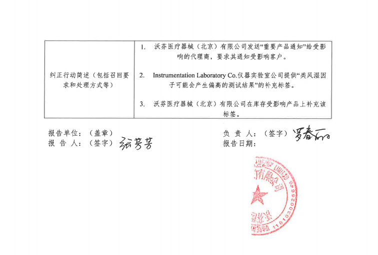 沃芬医疗器械商贸(北京)有限公司 报告,由于 近期IL的内部测试发现,4个批次的HemosIL von Willebrand Factor Antigen (货号:0020002300)不符合其标签上关于“类风湿因子不超过750 IU/mL时结果不受影响”的声明。IL 调查认为,在ACL TOP系列和ACL TOP 50系列上测定时,关于类风湿因子(RF)影响的声明应修改为:类风湿因子可能会产生偏高的测试结果。 虽然没有已知的客户投诉,但如果患者样本包含高水平的类风湿因子,可能存在检测结果错误的潜在风险。如果发生此种情况,可能会导至VWF:Ag的检测结果偏高,从而掩盖了其偏低的异常检测结果,这可能会将本应判断为VWD的而判断为低的或正常的VWF水平。然而,VWD的诊断需要包括临床背景和重复验证试验等其他信息。没有任何治疗是仅基于单一的VWF: Ag结果。因此,这个问题的安全风险可以忽略不计 等原因,Instrumentation Laboratory Co.仪器实验室公司 对其生产的血管性血友病因子抗原检测试剂盒(免疫比浊法) HemosIL von Willebrand Factor Antigen(注册或备案号:国械注进20193402179)主动召回。召回级别为 三级 。涉及产品的型号、规格及批次等详细信息见《医疗器械召回事件报告表》。