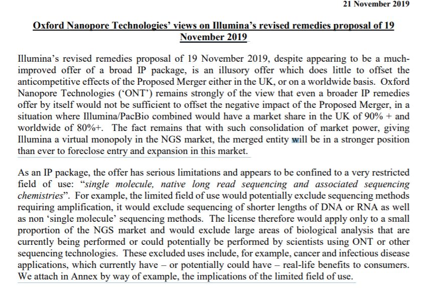 2018年11月,基因测序巨头Illumina拟对PacBio的12亿美元收购案一度引发全球基因测序行业的广泛关注。通过将Illumina的短读长测序技术和PacBio的长读长测序技术相结合,这项交易势必将进一步巩固Illumina在基因测序领域的优势地位。 但消息发布后,该交易迅速引起了英国监管部门的关注。2019年4月,英国反垄断监管机构——竞争和市场管理局(CMA)发表声明,表示已对该交易展开调查并正在探讨该收购可能带来的影响。2019年10月24日,CMA发布调查文件,表示已“暂时得出结论”:该收购计划将导至英国乃至全球下一代测序系统市场的竞争大幅减少。CMA认为,现阶段唯一可能有效的补救措施是禁止拟议的收购交易,以保持英国以及全球测序市场的竞争,并提议Illumina、PacBio和公众提出其他补救措施。本月,对于CMA发布的调查结果,Illumina及PacBio进行了回应并提出了相关补救措施。根据11月19日CMA发布的一项文件,Illumina和PacBio提议,如果这项收购完成,将为所有感兴趣的第三方提供Illumina及PacBio的pre-closing专利及专利申请的永久的、免版税的、不可变更的技术许可,但只可用于单分子和长读长测序,以及自然界存在的DNA/RNA测序系统和相关涉及测序的化学过程。此外,Illumina还建议为第三方建立争议解决机制,以解除各方对Illumina违反其承诺的担忧。(虽然Illumina已作出了颇为有力的让步,但这些提议举措似乎还难以完全消除CMA及该领域其他竞争对手的担忧。就在上周,英国第三代测序领域上游制造商Oxford Nanopore(牛津纳米孔)在一份提交至CMA的文件中对Illumin提出的补救措施进行了回应。Oxford Nanopore认为,Illumina公司向第三方授权相关知识产权以获得收购PacBio许可的提议还远远不够;相反,Oxford Nanopore提议,如果这项交易完成,Illumina应拆分部分业务,例如NovaSeq产品线——而这正是Illumina目前最为成功的核心测序平台。图:Oxford Nanopore对Illumin就收购PacBio提出的补救措施回应,图片来源:gov.uk 在这份11月21日提交至CMA并于昨日发布的文件中,Oxford Nanopore评论道:“这项空洞的提案无助于消除该收购在英国或全球范围内所带来的限制市场竞争的影响。”Oxford Nanopore重申了合并后的Illumina及PacBio将在“NGS市场上占据垄断地位”,预计其在英国的市场份额将超过90%,在全球的市场份额将超过80%。 此外,Oxford Nanopore还表示,Illumina提议开放的知识产权许可“存在严重的局限性,似乎仅限于一个非常有限的使用领域。”在Oxford Nanopore看来,Illumina补救措施中所定义的应用领域可能会排除非自然界存在的DNA测序等,例如cDNA或扩增的DNA。Oxford Nanopore在文件中写道,该许可仅适用于一小部分下一代测序市场,将无法涵盖当前及未来使用Oxford Nanopore或其他测序技术的大范围生物分析。在补充文件中,Oxford Nanopore列出了其认为可能不会被开放知识产权覆盖的应用领域,包括扩增子测序、STR测序、通过cDNA进行的RNA测序、宏基因组测序、无创产前检测、新生儿筛查、循环DNA分析、基于FFPE组织的DNA测序以及古DNA测序。Oxford Nanopore还强调,无论知识产权的覆盖范围最终如何,Illumina和PacBio仍然可以采取反竞争策略,以阻止竞争对手进入市场或扩张。鉴于市场的挑战以及合并实体的强大实力,Illumina和PacBio提供的知识产权许可无论多么宽泛,都无法在可预见的未来确保其从事反竞争行为。Oxford Nanopore建议,除了提供“广泛的知识产权许可”,合并后的公司应该拆分部分业务,例如Illumina的NovaSeq产品线。鉴于NovaSeq对Illumina业务的重要性,这一举措似乎很难成为现实。以Illumina第三季度的营收为例,NovaSeq测序仪的销售额为Illumina第三季度测序仪器的营收增长贡献达1.42亿美元。除此之外,Illumina首席执行官Francis deSouza在第三季度财报电话会议上还表示,NovaSeq近期已超过HiSeq X成为产生最多测序数据的平台且仍有广阔的发展机会。图:Shawn Baker就CMA调查结果评论,图片来源:gov.uk 值得关注的是,对于Illumina对PacBio的收购,并非所有机构都与Oxford Nanopore持类似意见。 在发布Oxford Nanopore回应文件的当天,CMA还发布了基因组学商业咨询公司AllSeq联合创始人Shawn Baker博士的一份评论,其中暗示CMA的调查结果有失客观。Shawn Baker强调,CMA将PacBio在不与Illumina合并的情况下保持偿债能力视为“既定条件”,但在评估竞争对手时并未考虑PacBio未来增长压力,并忽视了该公司的营收预测。鉴于PacBio最新的季度营收报告,尽管测序仪器销售额同比增长强劲,但是Sequel II平台的销售额却出现了连续的下降。他还暗示,CMA似乎忽视了那些认为Illumina和PacBio的合并将有利于测序市场的客户,只听取了那些认为长读长测序将在未来主导短读长测序客户的意见。对于Oxford Nanopore本次发表的意见,目前Illumina及PacBio还未作出回应。 |