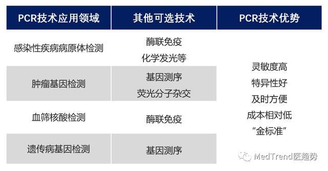 IVD增速最快的细分行业当属分子诊断,而分子诊断主要包括核酸诊断和生物芯片技术。核酸诊断主要分为聚合酶链式反应(PCR)和荧光原位夹杂(FISH)。 PCR目前在分子诊断细分技术中最为成熟且应用最广。 在这一技术红海的最远处,数字化PCR技术因为其先进性尚处于蓝海竞争市场,国内外企业积极参战,让这一领域的未来充满变数。与此同时,中国基层市场的“放量”,也为PCR市场的格局变化埋下伏笔。 临床诊断“金标准”——PCR技术 聚合酶链式反应(PCR)是一种用于放大扩增特定的DNA(或RNA)片段的分子生物学技术。其技术原理是以DNA双链结构为基础,利用DNA在体外高温时变性分解成单链,低温时引物与单链结合,在DNA聚合酶作用及适宜的温度下合成互补链。 简单来说,PCR是DNA(RNA)的体外复制技术。 PCR最大的特点,就是灵敏度高、特异性好、及时方便。因此,PCR应用广泛,不仅在基础研究方面,还包括医学诊断、法医学和农业科学等各大领域。 临床上,PCR反应灵敏度高,靶细胞检出率可达1/100万,病毒检测灵敏度≥3RFU,最小细菌检出率为3个细菌,检测样本纯度要求低,仅需DNA粗提取;扩增反应在2-4小时内完成,使用简便、快捷。 已经成为多种临床诊断的“金标准”PCR技术,广泛应用于感染性疾病病原体检测、肿瘤基因检测、血筛、遗传病基因检测等多个领域。 ![]() ▲PCR技术应用领域 最前沿:第三代数字PCR技术 自1985年PCR技术发现以来,不断更新迭代,目前已经发展至第三代数字PCR技术。 第一代定性PCR技术基本上已经为市场淘汰。第二代荧光定量PCR技术(Real-Time PCR,简称qPCR)为主流应用平台。二代荧光定量PCR仪在当下乃至未来较长一段时间都会是最受欢迎的PCR仪类型。高端荧光定量PCR品牌包括赛默飞、罗氏、赛沛(Cepheid)等,国内厂商如上海领成、西安天隆、杭州朗基、珠海黑马、杭州博日等品牌也正在发力。第三代数字PCR技术(Digital PCR,简称dPCR)。 ![]() ▲PCR细分技术生命周期 *PCR技术分化过程中还形成了ARMS法、HRM法等。 数字PCR技术力求做到对DNA绝对定量。利用对样品进行分液处理成为大量“微反应器”,进而实现“单分子模板PCR扩增”。该策略使得PCR技术具有更高的检测灵敏度、精确性和重复性。数字PCR灵敏度可达到单个核酸分子,检测限低至0.001%,抗干扰性强。 数字PCR技术的应用范围广泛,在肿瘤检测、传染病检测、遗传病等疾病检测上具有极大的优势。 基于分液方式的不同,数字PCR主要分为3种: 微流体数字PCR(Microfluidic digital PCR,mdPCR);微滴数字PCR(Droplet digital PCR,ddPCR);芯片数字PCR(Chip digital PCR,cdPCR)。Markets and Markets报告指出:全球定量PCR和数字PCR市场将以8.9%的年复合增长率增长,到2022年将达到53.1亿美元。虽然目前二代定量PCR占据更多的市场份额,但是,预计三代数字PCR增长将超过定量PCR。数字PCR作为目前市场上最前沿的产品,近年来开始崭露头角。 哪些企业“赢在未来”? 数字PCR技术是目前最先进的PCR技术,如果说投资第二代荧光定量PCR技术让企业赢在现在的话,投资第三代数字PCR技术则让企业赢在未来。因此,企业纷纷入局。 1、伯乐——微滴数字PCR技术 伯乐(Bio-Rad)是PCR市场的重要参与者之一,也是最早布局拥有PCR完整解决方案,包括普通PCR仪器、荧光定量PCR仪器以及移液器。 2011年,Bio-Rad毅然投身数字PCR技术,这一布局让Bio-Rad在数字PCR乃至PCR未来市场上占据领先位置。 Bio-Rad的数字PCR技术主要来源于收购。 2011年,伯乐以1.62亿美元收购QuantaLife。当时,QuantaLife已利用油包水微滴生成技术开发了微滴式数字PCR技术,这也是最早出现的相对成熟的数字PCR平台。收购完成后,QuantaLife 微滴式数字PCR仪产品更名为QX100继续在市场上销售,这个早期型号为dPCR概念的普及和应用领域的拓展发挥了重要作用。2013年Bio-Rad又推出了升级型号QX200。 ![]() 2017年,伯乐再次收购8700万美元收购液滴式数字PCR系统制造商RainDance Technologies。RainDance于2012年推出Raindrop型号数字PCR。该收购进一步巩固了其在液滴数字PCR市场的地位。 2、赛默飞世尔——芯片数字PCR技术 分析仪器市场巨头赛默飞世尔(Thermo Fisher)同样通过并购进入数字PCR领域。 2013年4月,赛默飞世尔以136亿美元收购Life Technologies,并继承其22亿美元净债务。 2013年6月,Life Tech发售QuantStudio 3D数字PCR系统。值得注意的是,不同于伯乐的微液滴数字PCR系统,这款QuantStudioTM 3D数字PCR系统采用硅基材料纳升微孔板芯片技术。 ![]() ▲QuantStudio 3D芯片数字PCR系统 3、Illumina——投资入局微滴数字PCR市场 2018年11月,Illumina Ventures领投法国Stilla Technologies1600万欧元(约1亿余人民币)的A轮融资。 Stilla Technologies这家成立于2013年的初创公司,于2016年推出Naica crystal微滴数字PCR系统,专门从事分子生物学的研究机构精确定量DNA突变。 ![]() ▲Naica crystal微滴数字PCR系统 4、罗氏、凯杰纷纷入局数字PCR市场 2018年11月,在美国召开的分子病理学协会年会上,罗氏报告了自家数字PCR仪的研发进展。相关负责人表示,数字PCR仪正处于原型研发阶段。 凯杰长期以来一直是实时定量用光PCR市场的领跑者,但数字PCR是它尚未涉足的一个领域。 直到2019年1月,JP Morgan Healthcare Conference上,凯杰宣布收购Formulatrix公司数字PCR技术,正式进军数字PCR市场。凯杰表示将利用Formulatrix公司的技术开发一种手持电池驱动的数字PCR系统,促进Quanti FERON-TB Gold技术检测贫困地区潜在结核病感染