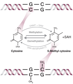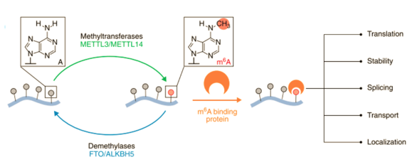 二、甲基化的生理功能 正常情况下,DNA和RNA甲基化都具有正常的生理功能。 5mC-DNA甲基化能够调节基因表达水平,例如通过调节DNA对应不同蛋白的表达调节胚胎发育,器官形成等。 m6A-RNA的功能则更为多样,在多个实验中观察到剪接的外显子和内含子显着富集了m6A峰,表明m6A与mRNA的选择性剪接之间的内在联系。目前推测,m6A对RNA剪接的作用可能是由于甲基化的发生会干扰剪接因子和mRNA之间的结合和相互作用,而m6A簇出现的位置可能恰好为某些RNA结合蛋白的结合位点。 除此之外,m6A还能够调控mRNA翻译,大多数m6A修饰发生在外显子,m6A在剪接后仍保留在成熟的mRNA中,因此,m6A也可以影响含m6A的mRNA的翻译。但是m6A对蛋白质翻译的影响似乎在不同的mRNA中是不同的(可能上调,可能下调)。m6A与miRNA结合位点之间的存在着很强的相关性。已有相关证据证明了m6A影响microRNA前体的剪接加工:m6A在转录本上的存在会影响选择性剪接,这种标记的核Readers蛋白能够介导核转录本的处理。另外,m6A也影响了mRNA的稳定性和出核效率。
