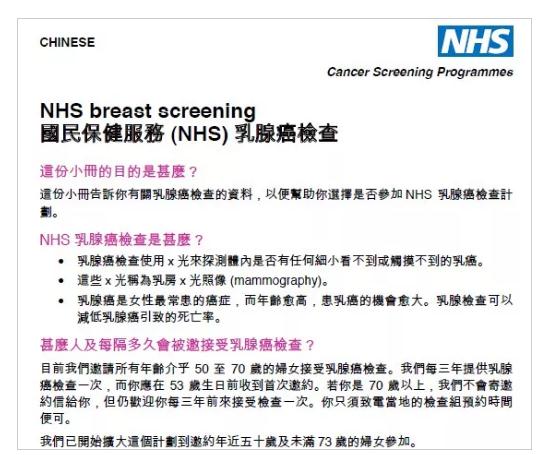 英国国民保健服务为50岁以上的妇女提供乳腺癌筛查,还专门制作了中文版。/ NHS 爱茉莉太平洋两癌筛查项目已经连续开展四年,作为该项目组的一员,每年夏天是组长张颖最忙碌的时候。在这一季节,她的任务就是和各个县的村医一起动员村里的适龄妇女接受两癌筛查。 张颖介绍,迄今为止,两癌筛查项目的足迹已经遍及5省22县,累积为7万余名贫困地区女性提供了免费的两癌筛查。但张颖发现,筛查地区间差异较大,受到区域、方言、经济水平等因素的影响,要想让所有女性接受筛查着实有些困难。 吴丹博士也表示,女性特别是45岁以上的女性需要提高宫颈癌预防的意识,定期进行妇科检查,就可以预防并做到早期发现、早期干预,最大程度地避免宫颈癌的发生。“当HPV16/18型为阳性时,应立即转诊阴道镜。当高危型HPV检测结果为阴性时,5-10年内罹患宫颈癌的机会几乎为零。”吴丹教授指出。