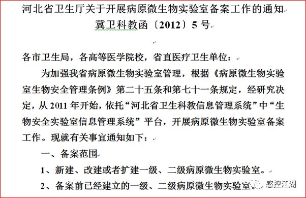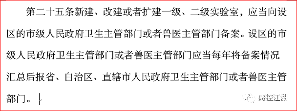 根据中华人民共和国(国务院令第424号)《病原微生物实验室生物安全管理条例》(2004.11.12实施)第二十五条:新建、改建或者扩建一级、二级实验室,应当向设区的市级人民政府卫生主管部门或者兽医主管部门备案。设区的市级人民政府卫生主管部门或者兽医主管部门应当每年将备案情况汇总后报省、自治区、直辖市人民政府卫生主管部门或者兽医主管部门。