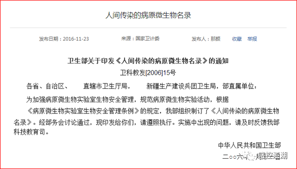 2006年当时的国家卫生部制定并发布了《人间传染的病原微生物名录》名录,其中对每一种病原微生物的每一种操作可以在哪一级生物安全实验室进行都有明确的规定。