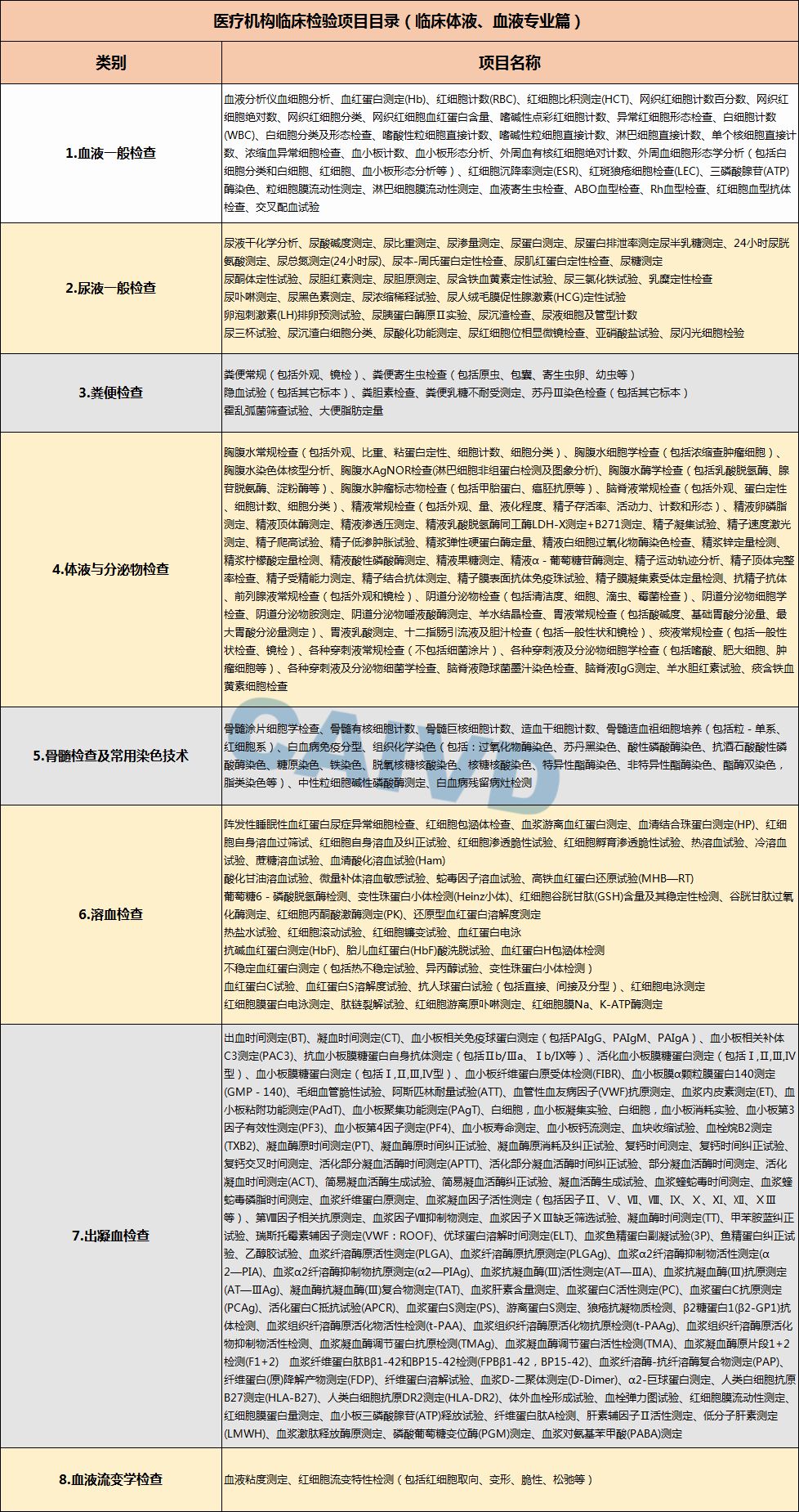 临床检验是将病人的血液、体液、分泌物、排泄物和脱落物等标本,通过目视观察、物理、化学、仪器或分子生物学方法检测,从而为临床、为病人提供有价值的实验资料。临床检验是一门多学科互相渗透、交叉融合的综合性应用学科,涉及化学、物理学、生物学、生物化学、免疫学、微生物学、生理学、病理学、遗传学、分子生物学、统计学和多门临床医学等学科。 临床检验项目对规范医疗机构临床检验工作,满足临床医疗需求,保证医疗质量和医疗安全起着重要的作用。而临床体液、血液作为检验科较常见的检验项目,小到粪便、大到骨髓检查,对疾病的诊断,也起着关键作用。临床体液、血液项目检查分为八大类:血液一般检查、尿液一般检查、粪便检查、体液与分泌物检查、骨髓检查及常用染色技术、溶血检查、出凝血检查、血液流变学检查,详细汇总如下:
