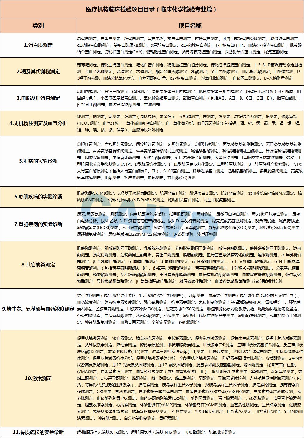 临床化学检验是利用物理学、生物学、遗传学、病理学、免疫学、生物化学和分子生物学的理论与技术,探讨疾病的发病机制,研究其病理过程中的特异性化学标志物或体内特定成分的改变的一门学科和技术。临床化学检验项目检查分为11大类:1.蛋白质测定;2.糖及其代谢物测定;3.血脂及脂蛋白测定;4.无机物质测定及血气分析;5.肝病的实验诊断;6.心肌疾病的实验诊断;7.肾脏疾病的实验诊断;8.其它酶类测定;9.维生素、氨基酸与血药浓度测定;10.激素测定;11.骨质疏松的实验诊断。