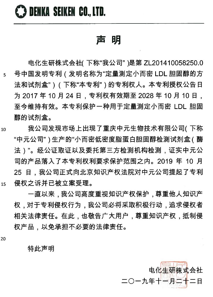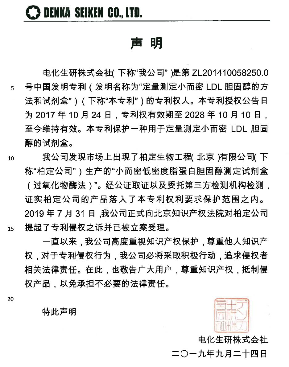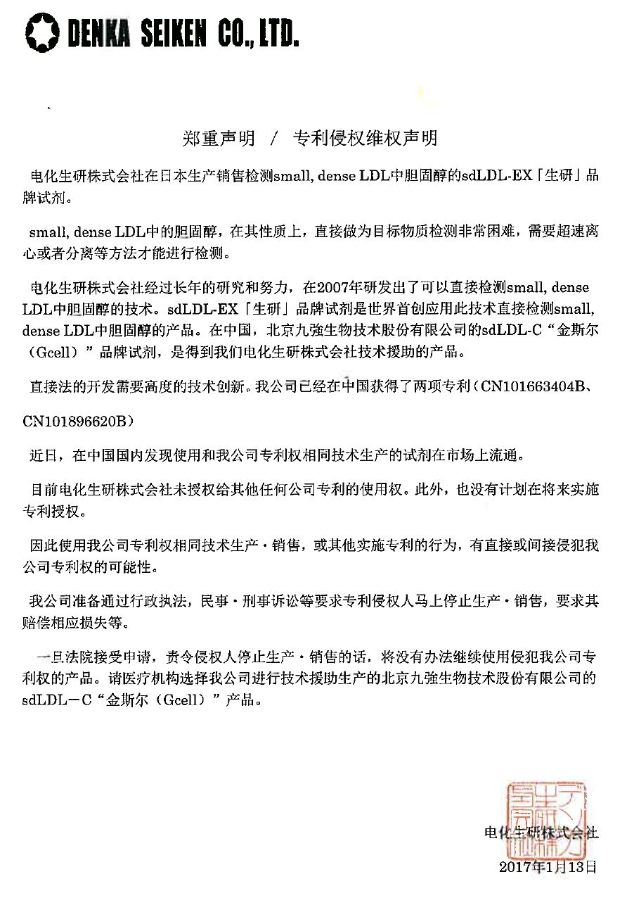 据电化生研株式会社官网公告,早在2017年1月已发布过专利维权声明,并指出:”电化生研株式会社经过长年的研究和努力,在2007年研发出了可以直接检测小而密低密度脂蛋白(small, dense LDL)中胆固醇的技术。sdLDL-EX「生研」品牌试剂是世界首创应用此技术直接检测小而密低密度脂蛋白(small, dense LDL)中胆固醇的产品。在中国,北京九強生物技术股份有限公司的sdLDL-C“金斯尔(Gcell)”品牌试剂,是得到我们电化生研株式会社技术援助的产品。““在中国国内发现使用和我公司专利权相同技术生产的试剂在市场上流通。我公司准备通过行政执法,民事・刑事诉讼等要求专利侵权人马上停止生产・销售,要求其赔偿相应损失等。”这无疑是一份警告。