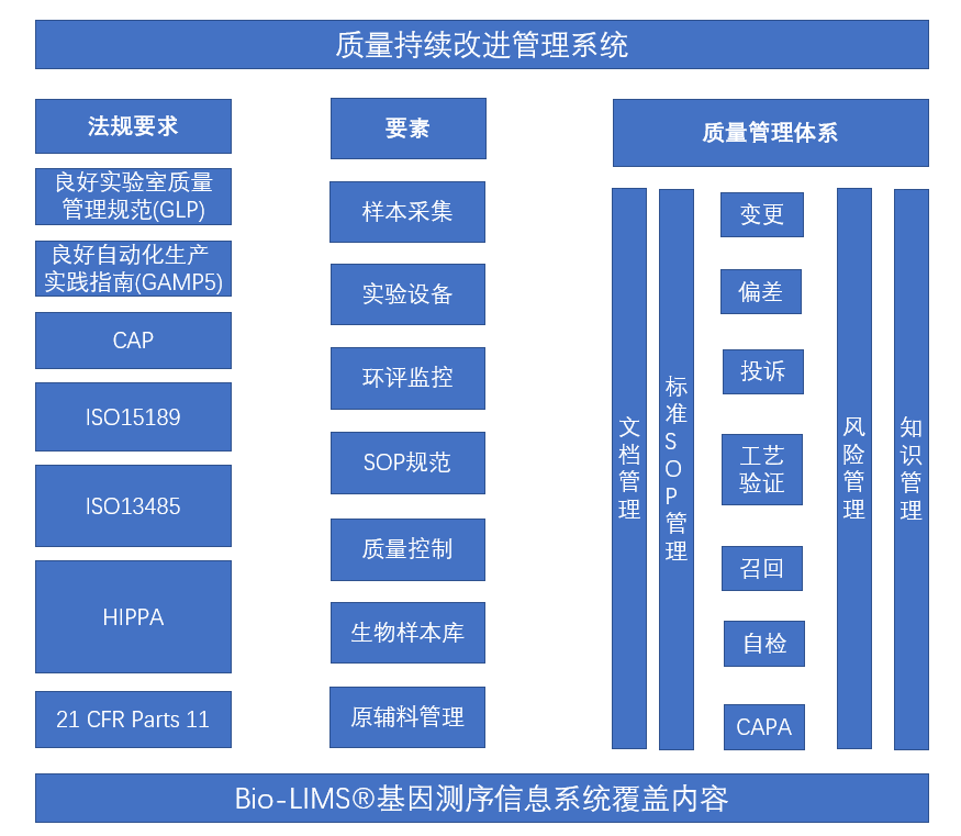 在国内,分子诊断领域处于多部门管理之下,第三方医学检验所在开展临床基因检测业务时需要遵循《临床基因扩增检验实验室》、《中华人民共和国人类遗传资源管理条例》、《高通量测序技术临床检测规范化应用规范》等法规或者专家共识,还会考虑通过ISO 15189、美国病理家协会(CAP) 等认证体系。这些质量体系都有专门的章节阐述了对实验室信息管理系统的要求,检查人员来实验室审查时,更愿意在系统中可以一目了然的查看实验记录。实验室信息管理系统应遵循这些质量体系的要求,并支持中国药品监督管理局(NMPA)对计算机化系统提出的计算机系统的确认与验证,包括设计验证(DQ),安装验证(IQ),操作验证(OQ)和性能验证(PQ)等。系统应遵循FDA 21 CFR Part 11 (联邦法案21章11款,电子签名和电子签章)。如果涉及到患者信息,还应遵循HIPPA法案,保证对患者隐私的保护以及患者信息完整性。使用系统还应该能辅助实验室满足ISO 15189与CAP等的质量体系标准。