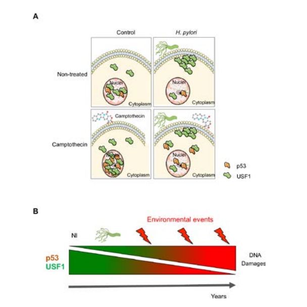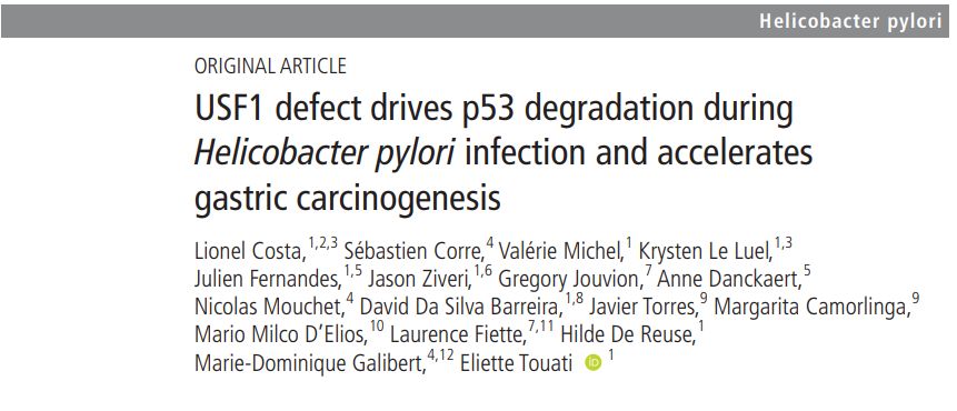 胃癌是导至癌症相关死亡的第三大最常见原因,通常预后较差,多数情况下是一种“发现即晚期”的凶狠病症,因此难以治疗。目前认为幽门螺杆菌是全世界约90%胃癌病例的元凶。它定植在全球近一半人口的胃中,虽然在大部分感染个体中并无症状,但在某些情况下会发展成为胃癌。 为了降低胃癌的死亡率,确定能够早期诊断胃癌的生物标志物势在必行。多家科研院所的研究学者合作研究了幽门螺杆菌感染期间胃癌发展的机制,从而确定了潜在的易感标记USF1,此项研究结果发表在《GUT》杂志上。 http://dx.doi.org/10.1136/gutjnl-2019-318640p53蛋白被称为“基因组守护者”,其对于维持细胞正常的功能至关重要,如果基因组发生重大破坏,p53可以暂时停止细胞周期以修复DNA。如果p53失活,则基因组更有可能积累不稳定性,由正常细胞转化为癌细胞的几率更大。已有的研究结果也表明幽门螺杆菌能够通过激发潜在靶标p53突变的积累,导至DNA断裂并损害DNA修复系统。研究小组先前进行的研究表明,DNA损伤后,p53通过与转录因子USF1相互作用,从而在DNA修复中发挥作用。幽门螺杆菌不仅降低了USF1因子在细胞核中的表达水平,而且使其在细胞外围发生积聚,从而阻止了USF1 / p53复合物的形成,继而使p53蛋白稳定性降低至失去其功能,这会导至受感染细胞中致癌变化的累积,从而促进其转化为癌细胞。因此,USF1在细胞核中的丢失是抑制p53活性的关键因素。 在缺乏USF1的小鼠模型中,由幽门螺杆菌感染引起的胃炎性病变更为严重。这些结果也得到了临床结果的支持:对于USF1和p53水平低的胃癌患者预后更差。此次研究首次证明转录因子USF1的丧失会加速幽门螺杆菌引起的癌变,USF1水平的变化可能是胃癌患者预后不良的指标,从而可以识别出癌症风险更高或更严重的患者亚群。未来USF1可以作为治疗胃癌的新型靶标,使患者能够得到早期治疗,防止胃癌的恶性发展。参考资料: [1] USF1 defect drives p53 degradationduring Helicobacter pylori infection and accelerates gastric carcinogenesis [2] Gastric cancer susceptibility marker discovered |
