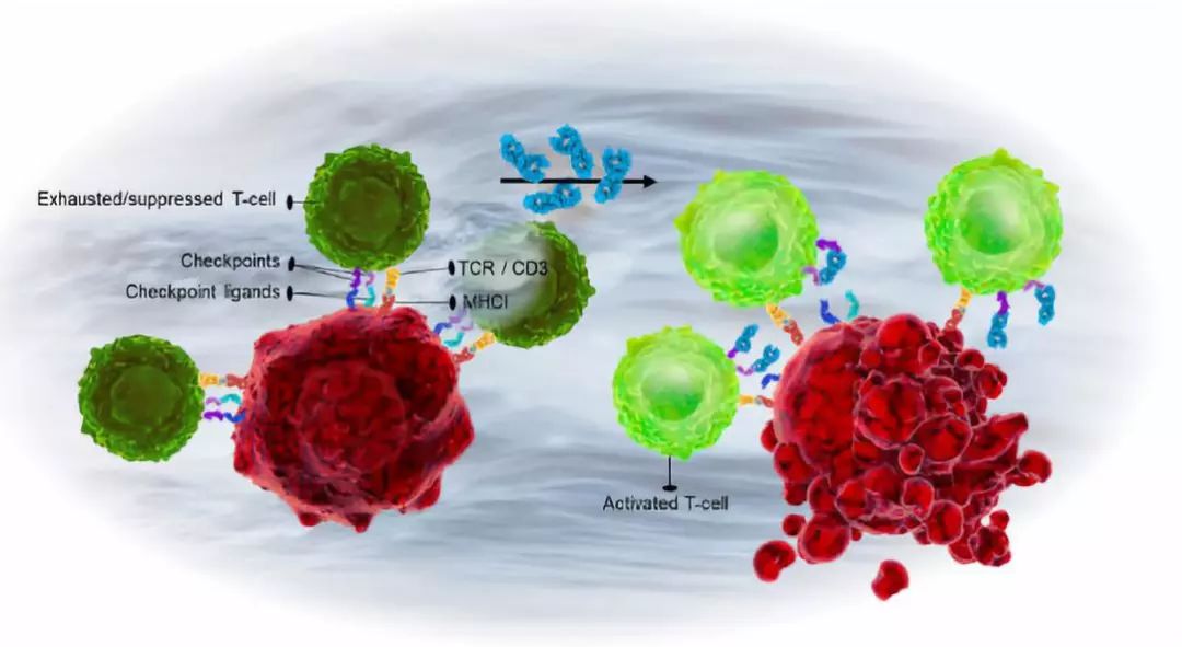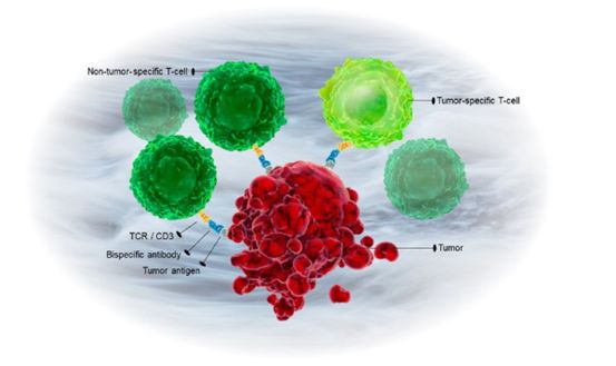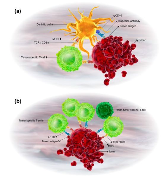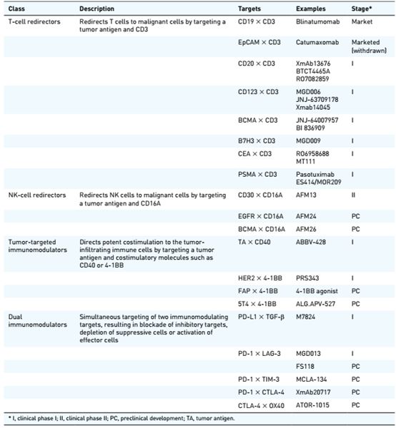 随着免疫检查点抗体CTLA-4,PD1,PD-L1在肿瘤免疫治疗领域取得成功,目前,更具安全性和有效性的双特异性抗体已经崭露头角,并且,正在以惊人的速度增长。本文将主要描述3类免疫治疗双特异性抗体:(a)毒性效应细胞重定向;(b)靶向肿瘤免疫调节剂;(c)双免疫调节剂。毒性效应细胞重定向双特异性抗体以T细胞重定向为主,这类双特异性抗体同时靶向肿瘤相关抗原和TCR/CD3复合物,重定向杀伤性T细胞到恶性肿瘤细胞。这也是目前最成熟的双特异性抗体免疫疗法,已有两种双特异性抗体上市,还有几种该类双特异性抗体处在临床试验阶段。肿瘤免疫调节剂双特异性抗体指的是一类同时靶向肿瘤抗原和免疫调节受体的双特异个性抗体,比如靶向CD40或4-1BB,该类双特异性抗体通常设计为失活状态,直到结合肿瘤抗原才被激活,因此,通常定位于肿瘤微环境的免疫刺激,最小化其它地方的免疫激活效应。这一设计旨在有效的激活肿瘤特异性T细胞,减少免疫相关副反应。最后,双免疫调节剂是一种结合两种不同免疫调节靶点的双特异性抗体,例如靶向PD-1或PD-L1结合靶向LAG3或TIM3,双靶点。其原理是同时诱导对同一细胞表面不同靶点的免疫强于单克隆抗体。本文将描述以上3类双特异性抗体,并举例说明双特异性抗体的研发。 在过去的几年里,抗体免疫疗法给肿瘤治疗到来了革命性的改变,这主要体现在超级耐受和长期生存的明显改善。第一款上市的肿瘤免疫治疗抗体是针对CTLA-4的免疫抑制剂ipilimumab ,2011年获准治疗黑色素瘤,紧随其后的是2014年上市的PD-1抗体nivolumab 和pembrolizumab ,以及2016-2017年上市的PD-L1抗体atezolizumab, avelumab 和durvalumab ,截止目前,肿瘤免疫治疗抗体已获准适用于多种肿瘤类型,包括黑色素瘤,霍奇金淋巴瘤,默克尔细胞腺瘤,非小细胞肺癌,头颈癌,肾癌,膀胱癌,结肠癌,肝癌,胃癌和食管癌。 在转移性黑色素瘤中,长期存活(超过三年),ipilimumab抗体治疗响应率接近20%,PD-1抑制剂响应率在35-50%。尽管单克隆抗体免疫治疗取得的成绩是喜人的,但是不可否认的是绝大多数患者对于单抗免疫治疗仍然无反应。另外,免疫相关不良事件如结肠炎,腹泻,皮肤毒性,内分泌病,肝毒性,肺炎等限制了免疫治疗单克隆抗体在临床中的应用。联合疗法似乎比单一疗法更能提高患者的长期存活率,但疗效的提高是以副作用为代价的。 双特异性抗体在临床有效性和安全性方面更具潜力,因此被称为下一代免疫疗法。近年来,双特异性抗体有了长足的发展。目前,已有众多双特异性抗体处在临床和临床前研究阶段。这里面占据主导位置的双特异性抗体还是靶向CD3,T细胞重定向和靶向肿瘤抗原的双特异性抗体。这一概念建立在这样一个事实上,即双特异性抗体将通过CD3结合并激活T细胞,并通过肿瘤抗原结合特性将这些T细胞重定向到肿瘤区域。这种方法的一个明显缺点是CD3会不加选择地招募T细胞。因此,我们现在看到第二代双特异性抗体的出现,新的方法正在探索,以实现更有选择性的招募和激活肿瘤特异性T细胞,或更强大的免疫调节靶向两个不同的免疫调节途径。 双特异性抗体可以看作是两种治疗药物合并成一个更好的实体,拥有两种药物的效果。表面上来看,这似乎已经达到了双特异性抗体的最终目的,但仅仅是两种抗体的简单组合是远远不够的。事实上,大多数公司开发双特异性抗体的目的是产生一种性能优于两种单特异性药物组合的药物,或者是创造一种仅靠单特异性抗体混合物无法实现理想治疗疗效的药物。 因此,双特异性抗体的评判标准是很高的,这就意味着双特异性抗体药物的研发所需要考虑的因素较传统单克隆抗体药物研发还要多的多。为了获得理想的临床效果和安全性,同时考虑到可开发性和制造成本,不同形式的双特异性抗体的固有属性必须仔细考虑比较。此外,双特异性抗体针对两个靶点的剂量控制不能像联合用药一样自由控制,都需要提前考虑两个靶点抗体相对亲和力的比例。另一方面,双特异性抗体较同时研发两种单克隆抗体药物复杂程度和工作量上有所降低,例如,在建立剂量考虑方面无需考虑二者联合用药的比例。除此之外,每一个双特异性抗体药物的研发都必须基于合理的生物学原理。 双特异性抗体较单抗联合用药的最大益处在于有效性和安全性。双特异性抗体一定程度上提升了有效性。其中一种设计理念是细胞毒性效应细胞的重定向作用,包括T细胞或NK细胞的重定向,该类双特异性抗体使得毒性效应细胞重定向于表达特异性肿瘤抗原的恶性肿瘤细胞。另一个类似的设计理念是靶向肿瘤免疫调节剂,该类双特异性抗体主要集中在激活肿瘤区域的药理学作用,因此与全身的系统免疫调节相比更具有效性,而且毒副作用相对较低。第三种设计理念是双免疫调节剂,该类双特异性抗体可以同时激活两个不同的调节通路,类似于两种药物的联用,同时也赋予了额外的协同作用,起到了两种药物联用无法企及的新的生物学效应。例如,增加细胞与细胞的相互作用,共刺激受体的聚集,可以增加免疫突触的稳定性,从而触发下游信号通路。 双特异性抗体的功能特性,以及最终的临床成功取决于三个主要因素:(1)生物学原理;(2)双特定抗体的形式;(3) Fc结构域的存在与否在及其性质。 生物学原理 生物学原理考虑了生物学靶点,功能模型,以及结合特性。对于靶向肿瘤抗原,T细胞