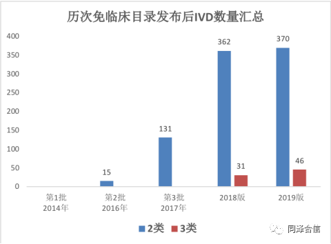 2019年12月,NMPA再次释放利好消息,发布了《关于公布新增和修订的免于进行临床试验医疗器械目录的通告》(2019年第91号),继续扩大了医疗器械和体外诊断试剂免临床目录的范围。 一、最新版目录内容解析 2019版目录,在2018版目录(2018年第94号文)的基础上,新增23项体外诊断试剂产品,对4项体外诊断试剂产品的名称和描述进行了修订,形成了截止目前最新的一版免临床目录。其中IVD产品2类合计有370个免临床,涵盖《注册管理办法》列举的全部11个种类;3类合计有46个免临床,继肿瘤标志物后,这次扩展到了病原体和毒麻类检测。