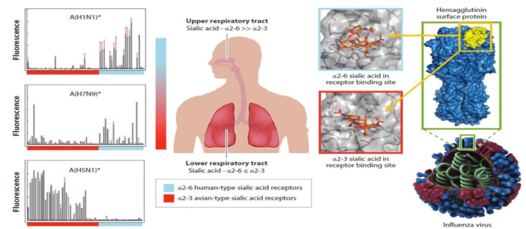 大家可能还会发现,感染H1N1、H3N2时症状多表现在上呼吸道,而如果感染了禽流感,则是下呼吸道症状明显。H7N9、H5N1的受体主要是α2-3,在下呼吸道,这可能就是它很少感染人,而一旦感染往往常表现为肺炎的原因。