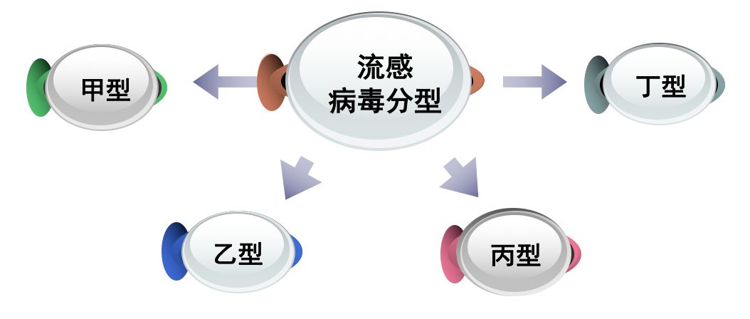 根据病毒核蛋白和基质蛋白,分为甲、乙、丙、丁(或A、B、C、D)四型。