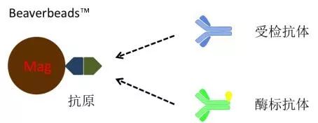 固相抗原竞争法 指受检抗体和酶标抗体竞争性的与磁珠表面抗原结合。固相抗原竞争法基本原理如下图所示。结合于固相载体的酶标抗体与受检抗体的量呈反比。 若受检样本中无抗体,酶标抗体能够顺利与抗原结合,出现强信号。若受检样本中有抗体,则竞争性的占去了酶标抗体与抗原的结合,酶标抗体的结合力减弱,信号强度减弱。 双抗夹心法(两步法) 双抗体夹心法是检测抗原最常用的方法,基本原理如下图所示。 双抗夹心法(一步法) 在一步法测定中,应注意钩状效应(hook effect),类同于沉淀反应中抗原过剩的后带现象。当标本中待测抗原浓度相当高时,过量抗原分别和固相抗体及酶标抗体结合,而不再形成夹心复合物,所得结果将低于实际含量。钩状效应严重时甚至可出现假阴性结果(如图, 双抗夹心法及双位点一步法。缺点:假阴性)