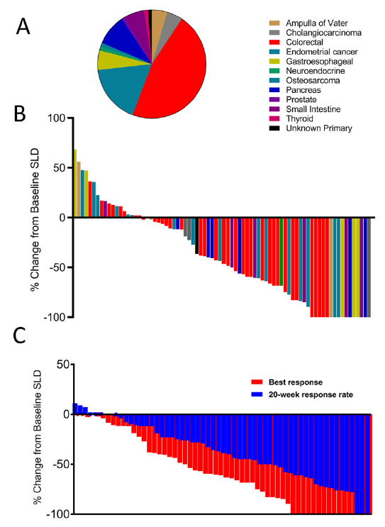 Chapter Four 王者归来:2017年MSI检测成为结直肠癌患者检测的必需选项 我们可以看出其实MSI算是一个历史比较悠久的Biomarker,而随着时间的推移,它不仅没有被新的Biomarker所取代,反而在肿瘤精准医疗中的地位越来越重要,原因就是近年来免疫治疗的横空出世又让MSI火了一把。 2015年,Le et al.首次在NEMJ杂志上报道了MSI-H/dMMR的晚期结直肠癌患者接受帕博利珠单抗(PD-1抑制剂)的疗效显著优于pMMR患者,证明了MSI-H/dMMR的状态可以预测PD-1抑制剂的疗效。 2017年同一团队又将此研究扩展到了12个不同的癌种中,结果显示MSI-H/dMMR的状态可以预测多个癌种中的帕博利珠单抗疗效(图 3)。基于此,2017年帕博利珠单抗获得FDA加速批准用于经治进展的不可切除或转移性的MSI-H/dMMR实体瘤患者,这也是FDA首次不依照肿瘤来源,而是依照生物标志物进行区分的抗肿瘤疗法。在这个肿瘤精准医疗的时代,它具有里程碑式的意义,也代表人类对肿瘤的认识更上一层楼。 紧接着于2017和2018年,基于Checkmate-142的研究结果,纳武利尤单抗单药(PD-1抑制剂)和纳武利尤单抗联合低剂量伊匹木单抗(CTLA-4抑制剂)获得FDA批准用于既往治疗过的MSI-H/dMMR转移性结直肠癌患者。 多个MSI相关的免疫治疗临床研究均采用了金标准—PCR扩增+毛细管电泳法,对MSI进行检测。Checkmate-142(纳武利尤单抗)和正在进行的德瓦鲁单抗(Durvalumab)和阿维鲁单抗(Avelumab)的II期临床研究(NCT03435107和NCT03150706)选用的是“2B3D”NCI Panel对MSI状态进行评估。另外,Keynote-016和Keynote-059(帕博利珠单抗)临床试验选用的是美国Promega公司的MSI检测Panel,它包括BAT-25、BAT-26、NR-21、NR-24、MONO-27及两个用于质控的五核苷酸重复位点PentaC和PentaD,有研究提示该Panel在欧美人群中的敏感性高于 “2B3D”NCI Panel。 图 3