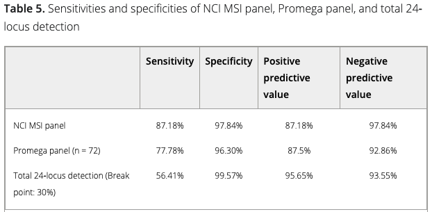 Chapter Five 落地中国:MSI检测位点选择的正确姿势 目前,国内市面上的MSI商用试剂盒位点选择各不相同,可以说是五花八门。比如有一个包含6个位点的Panel:NR-21、NR-24、NR-27、BAT-25、BAT-26 和 MONO-27,其位点的选择并没有参考权威标准的推荐。该Panel宣称其中的部分位点是参考国外的检测,其他位点是适合于中国人群的位点。但是我们并没有看到这6个位点在中国人群中的验证结果,性能没有经过验证的Panel是无法用于临床MSI检测的。 试问,不参考权威指南和共识推荐却自行选择微卫星位点的MSI试剂盒,它们的位点有没有经过严格的筛选?位点选择是不是有据可循?特异性、敏感性有没有在中国人群中进行验证?如果没有,这无疑是在拿肿瘤患者的生命开玩笑,是极其不负责任的做法!这样的试剂怎么可能给肿瘤患者提供一个准确的检测结果? 中国人群需要中国人群自己的数据来证实。 在过去的很长一段时间里,几乎所有的MSI相关研究都是基于欧美人群的,近些年才陆陆续续有来自于中国人群的MSI研究,这些研究发现中国人群和欧美人群的MSI发生率是存在差异的。国内外多个研究显示中国人群的MSI的发生率约为4%-13%,略低于欧美人群的MSI发生率8-20%,而埃及人的MSI发生率高达37%,因此MSI的发生是存在人种差异的。 近期,也有研究在中国人群中对比“2B3D”和Promega这两个Panel,一项于2017年发表在Future Oncology上的国内多中心研究结果表明,对于东亚裔人群的结直肠癌患者,“2B3D” NCI Panel灵敏度(87.3%)高于Promega(71.4%)(图 4)。2019年发表在Cancer Medicine上的另一项国内多中心研究,也得到了同样的结果(87.18% vs 77.78%)(图 5),提示“2B3D” NCI Panel可能更适合于东亚裔人群。 图 4