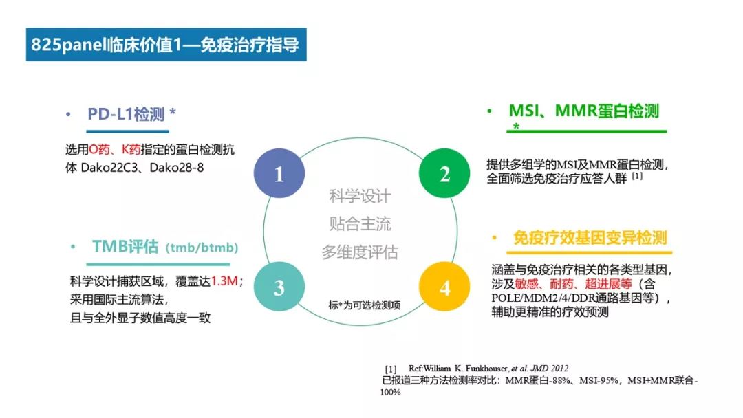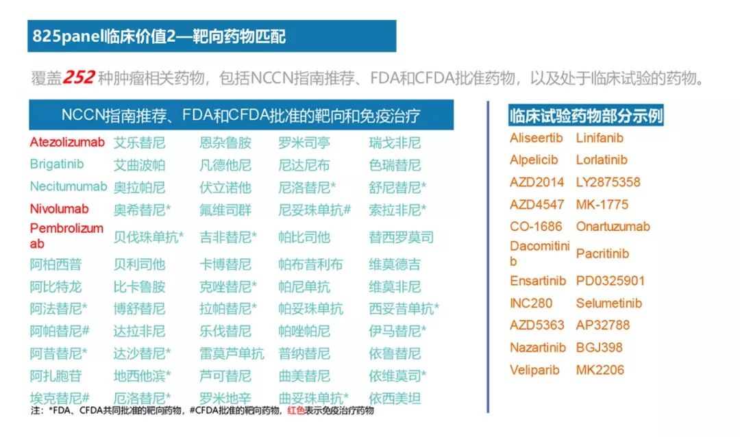 产品临床价值 1、辅助免疫治疗 在未经筛选的患者中,免疫治疗的有效率只有10%~30%。泛生子825基因检测通过科学设计捕获区域(覆盖区域>1Mb,并参考FDA获批的两个NGS大panel产品—F1CDX和MSK-IMPACT),采用国际主流算法,联合多检测平台可为临床提供TMB、PD-L1、MSI、MMR等免疫治疗相关生物标志物的检测,有效锁定免疫治疗获益人群,评估免疫治疗疗效,“引路”免疫治疗攻城拔寨。 2、靶向药物匹配 ▲825Panel临床价值(图片取自:泛生子,“*”为FDA、CFDA共同批准的靶向药物、“#”为CFDA批准的靶向药物,字体标红为免疫治疗药物) 涵盖NCCN指南推荐、FDA/CFDA批准,及部分处于临床试验阶段药物共计250多种肿瘤相关靶向药物。 3、全病程应用 血液版检测可为无法取得组织的患者无创便捷的提供更优检测方案;此外,血液版检测可实现多次取样,为患者达到疗前(肿瘤基因分型、靶向及免疫的个体化用药)、疗中(预后评估、耐药分析)、疗后(监测治疗情况、跟踪病情发展)的全病程管理应用,协助患者治疗方案的及时调整和更换。实体瘤825基因检测延续泛生子专有的无创液态活检技术(UDD-Seq)优势,采用独特双端身份标签UID技术标记原始ctDNA分子片段,结合超高深度测序和独有生信背景降噪算法,从而更好的实现对低频变异的准确检出,不遗漏对临床诊疗有价值的关键信息。 4、评估遗传风险 参考权威论文及指南,可同时检测148个遗传易感基因,涉及17个常见癌种、70种遗传综合征,致力于全面评估遗传易感风险。 5、化疗药物疗效评估 根据NCCN指南推荐药,依托权威药物基因组数据库PharmGKB,基于30个基因的46个位点,对19中常用化疗药物27中用药方案的有效性、毒副作用和用药剂量进行全面解读,使患者能更全面的了解自身基因突变情况,从而抓住更多接受创新性治疗的机会。 |